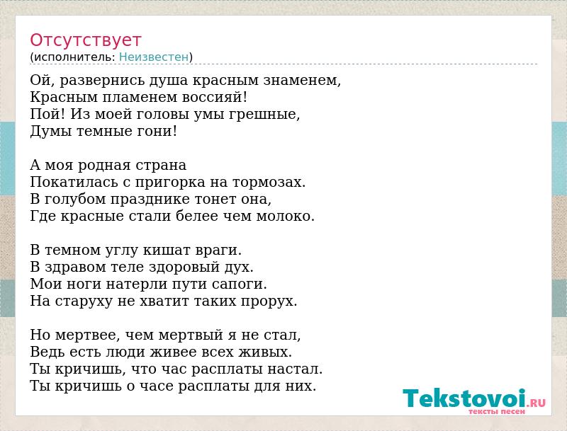 Ой, развернись душа красным знаменем, Красным пламенем воссияй! Пой! Из моей головы умы грешные, Думы темные гони! А моя родная страна Покатилась с пригорка на тормозах. В голубом празднике тонет она, Где красные стали белее чем молоко. В темном углу кишат враги. В здравом теле здоровый дух. Мои ноги натерли пути сапоги. На старуху не хватит таких прорух. Но мертвее, чем мертвый я не стал, Ведь есть люди живее всех живых. Ты кричишь, что час расплаты настал. Ты кричишь о часе расплаты для них.