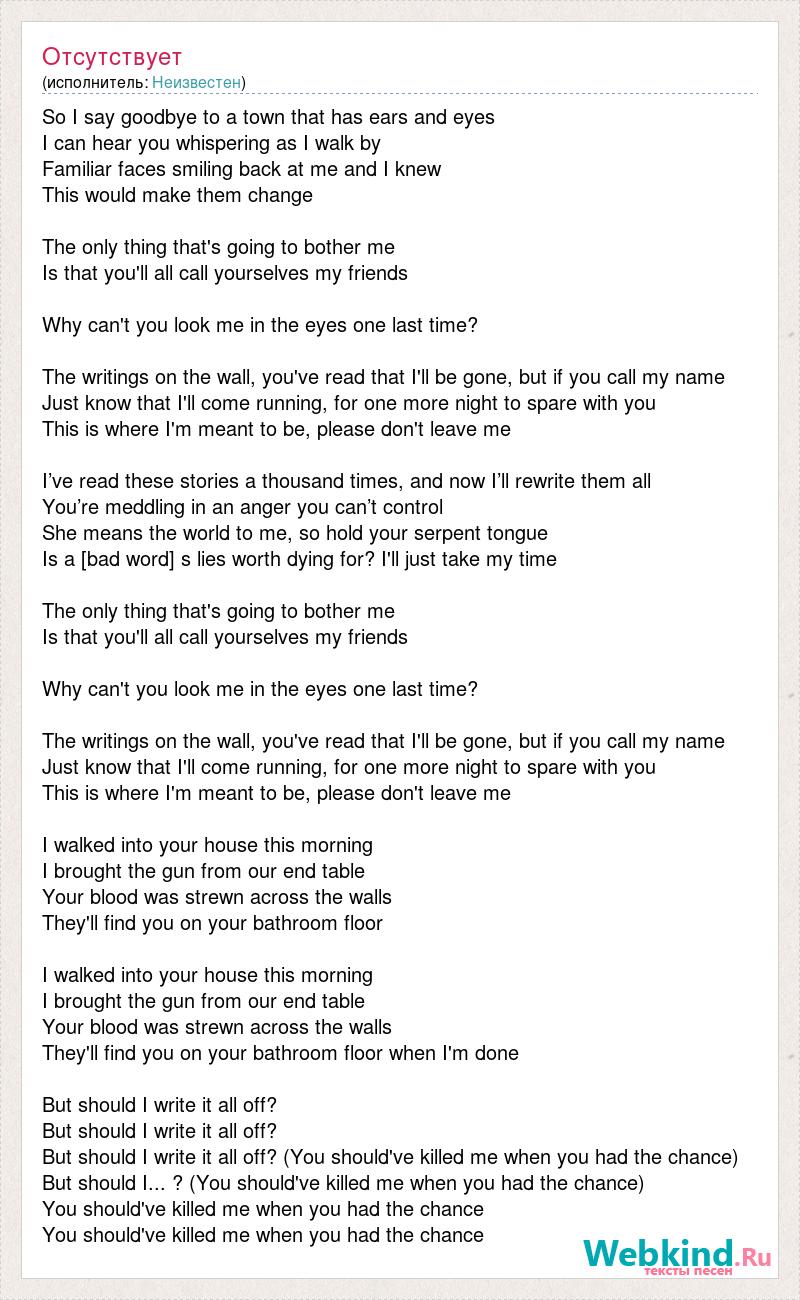 So I say goodbye to a town that has ears and eyes I can hear you whispering as I walk by Familiar faces smiling back at me and I knew This would make them change The only thing that's going to bother me Is that you'll all call yourselves my friends Why can't you look me in the eyes one last time? The writings on the wall, you've read that I'll be gone, but if you call my name Just know that I'll [bad word] for one more night to spare with you This is where I'm meant to be, please don't leave me I’ve read these stories a thousand times, and now I’ll rewrite them all You’re meddling in an anger you can’t control She means the world to me, so hold your serpent tongue Is a [bad word] s lies worth dying for? I'll just take my time The only thing that's going to bother me Is that you'll all call yourselves my friends Why can't you look me in the eyes one last time? The writings on the wall, you've read that I'll be gone, but if you call my name Just know that I'll [bad word] for one more night to spare with you This is where I'm meant to be, please don't leave me I walked into your house this morning I brought the gun from our end table Your blood was strewn across the walls They'll find you on your bathroom floor I walked into your house this morning I brought the gun from our end table Your blood was strewn across the walls They'll find you on your bathroom floor when I'm done But should I write it all off? But should I write it all off? But should I write it all off? (You should've killed me when you had the chance) But should I... ? (You should've killed me when you had the chance) You should've killed me when you had the chance You should've killed me when you had the chance