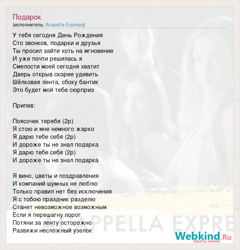 У тебя сегодня День Рождения Сто звонков, подарки и друзья Ты просил зайти хоть на мгновение И уже почти решилась я Смелости моей сегодня хватит Дверь открыв скорее удивить Шёлковая лента, сбоку бантик Это будет мой тебе сюрприз Припев: Поясочек теребя (2р) Я стою и мне немного жарко Я дарю тебе себя (2р) И дороже ты не знал подарка Я дарю тебе себя (2р) И дороже ты не знал подарка Я вино, цветы и поздравления И компаний шумных не люблю Только правил нет без исключения Я с тобою праздник разделю Станет невозможное возможным Если я перешагну порог Потяни за ленту осторожно Развяжи несложный узелок