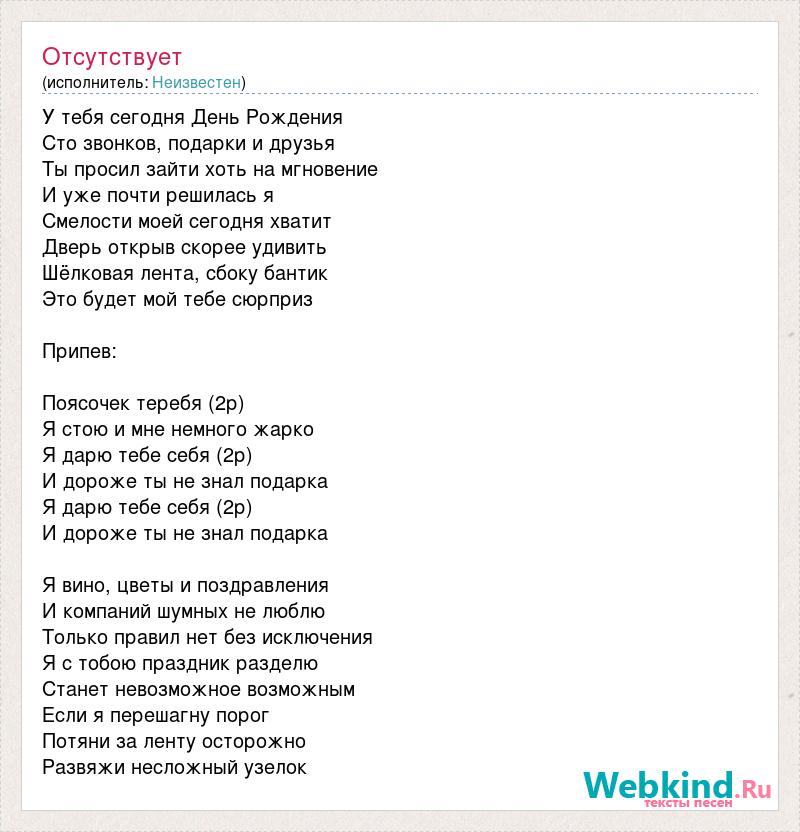 У тебя сегодня День Рождения Сто звонков, подарки и друзья Ты просил зайти хоть на мгновение И уже почти решилась я Смелости моей сегодня хватит Дверь открыв скорее удивить Шёлковая лента, сбоку бантик Это будет мой тебе сюрприз Припев: Поясочек теребя (2р) Я стою и мне немного жарко Я дарю тебе себя (2р) И дороже ты не знал подарка Я дарю тебе себя (2р) И дороже ты не знал подарка Я вино, цветы и поздравления И компаний шумных не люблю Только правил нет без исключения Я с тобою праздник разделю Станет невозможное возможным Если я перешагну порог Потяни за ленту осторожно Развяжи несложный узелок