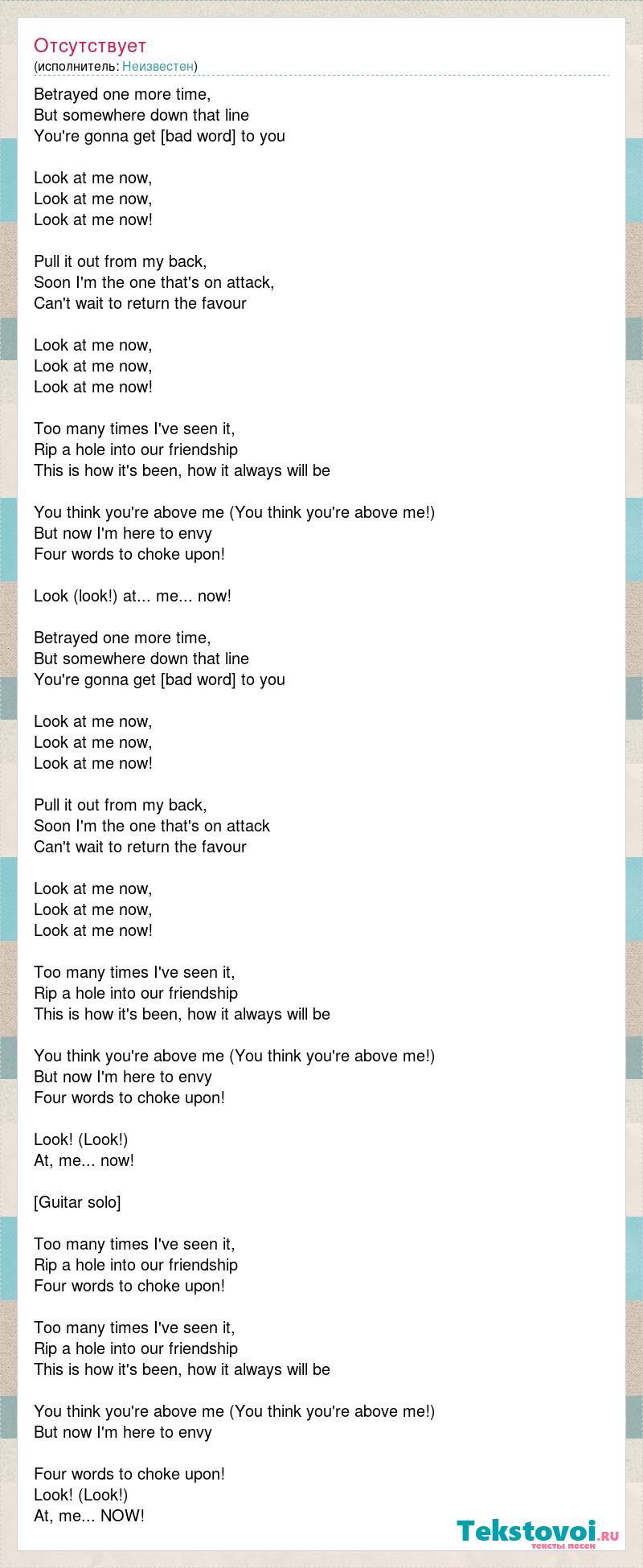 Betrayed one more time, But somewhere down that line You're gonna get [bad word] to you Look at me now, Look at me now, Look at me now! Pull it out from my back, Soon I'm the one that's on attack, Can't wait to return the favour Look at me now, Look at me now, Look at me now! Too many times I've seen it, Rip a hole into our friendship This is how it's been, how it always will be You think you're above me (You think you're above me!) But now I'm here to envy Four words to choke upon! Look (look!) at... me... now! Betrayed one more time, But somewhere down that line You're gonna get [bad word] to you Look at me now, Look at me now, Look at me now! Pull it out from my back, Soon I'm the one that's on attack Can't wait to return the favour Look at me now, Look at me now, Look at me now! Too many times I've seen it, Rip a hole into our friendship This is how it's been, how it always will be You think you're above me (You think you're above me!) But now I'm here to envy Four words to choke upon! Look! (Look!) At, me... now! [Guitar solo] Too many times I've seen it, Rip a hole into our friendship Four words to choke upon! Too many times I've seen it, Rip a hole into our friendship This is how it's been, how it always will be You think you're above me (You think you're above me!) But now I'm here to envy Four words to choke upon! Look! (Look!) At, me... NOW!