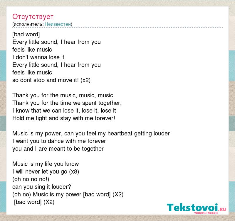 [bad word] Every little sound, I hear from you feels like music I don't wanna lose it Every little sound, I hear from you feels like music so dont stop and move it! (x2) Thank you for the music, music, music Thank you for the time we spent together, I know that we can lose it, lose it, lose it Hold me tight and stay with me forever! Muslc is my power, can you feel my heartbeat getting louder I want you to dance with me forever you and I are meant to be together Music is my life you know I will never let you go (x8) (oh no no no!) can you sing it louder? (oh no) Music is my power [bad word] (X2) [bad word] (X2)