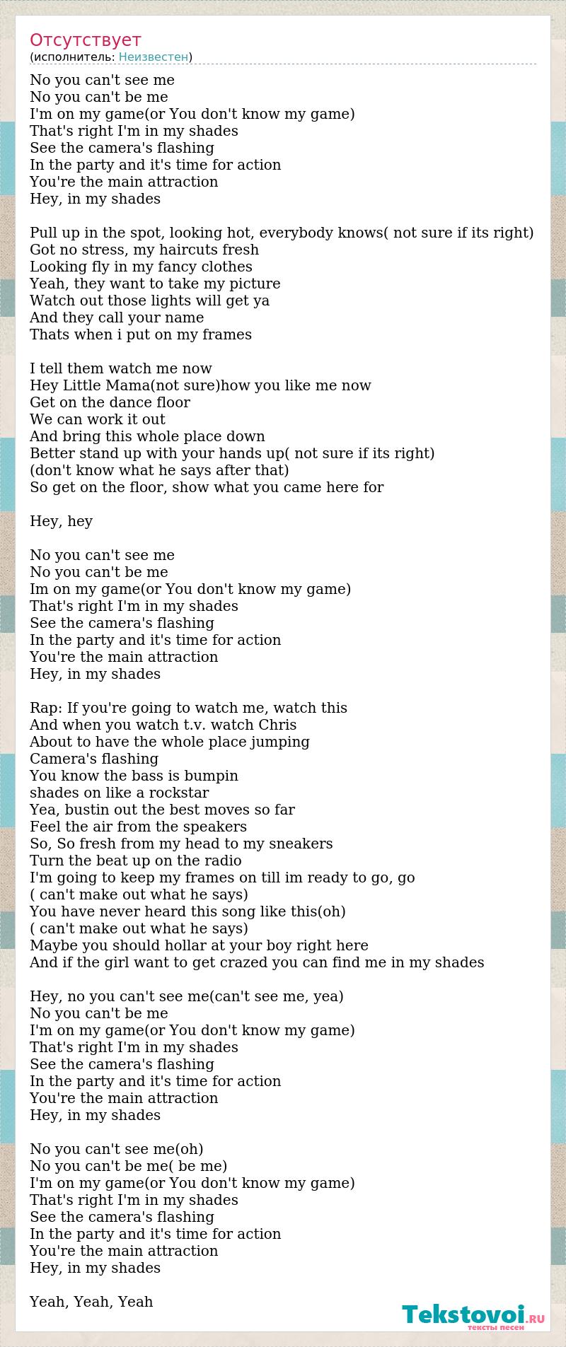 No you can't see me No you can't be me I'm on my game(or You don't know my game) That's right I'm in my shades See the camera's flashing In the party and it's time for action You're the main attraction Hey, in my shades Pull up in the spot, looking hot, everybody knows( not sure if its right) Got no stress, my haircuts fresh Looking fly in my fancy clothes Yeah, they want to take my picture Watch out those lights will get ya And they call your name Thats when i put on my frames I tell them watch me now Hey Little Mama(not sure)how you like me now Get on the dance floor We can work it out And bring this whole place down Better stand up with your hands up( not sure if its right) (don't know what he says after that) So get on the floor, show what you came here for Hey, hey No you can't see me No you can't be me Im on my game(or You don't know my game) That's right I'm in my shades See the camera's flashing In the party and it's time for action You're the main attraction Hey, in my shades Rap: If you're going to watch me, watch this And when you watch t.v. watch Chris About to have the whole place jumping Camera's flashing You know the bass is bumpin shades on like a rockstar Yea, bustin out the best moves so far Feel the air from the speakers So, So fresh from my head to my sneakers Turn the beat up on the radio I'm going to keep my frames on till im ready to go, go ( can't make out what he says) You have never heard this song like this(oh) ( can't make out what he says) Maybe you should hollar at your boy right here And if the girl want to get crazed you can find me in my shades Hey, no you can't see me(can't see me, yea) No you can't be me I'm on my game(or You don't know my game) That's right I'm in my shades See the camera's flashing In the party and it's time for action You're the main attraction Hey, in my shades No you can't see me(oh) No you can't be me( be me) I'm on my game(or You don't know my game) That's right I'm in my shades See the camera's flashing In the party and it's time for action You're the main attraction Hey, in my shades Yeah, Yeah, Yeah