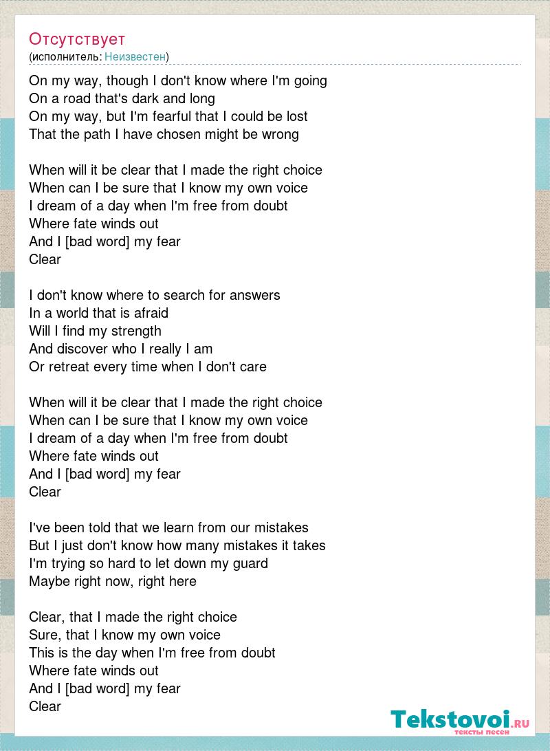 On my way, though I don't know where I'm going On a road that's dark and long On my way, but I'm fearful that I could be lost That the path I have chosen might be wrong When will it be clear that I made the right choice When can I be sure that I know my own voice I dream of a day when I'm free from doubt Where fate winds out And I [bad word] my fear Clear I don't know where to search for answers In a world that is afraid Will I find my strength And discover who I really I am Or retreat every time when I don't care When will it be clear that I made the right choice When can I be sure that I know my own voice I dream of a day when I'm free from doubt Where fate winds out And I [bad word] my fear Clear I've been told that we learn from our mistakes But I just don't know how many mistakes it takes I'm trying so hard to let down my guard Maybe right now, right here Clear, that I made the right choice Sure, that I know my own voice This is the day when I'm free from doubt Where fate winds out And I [bad word] my fear Clear