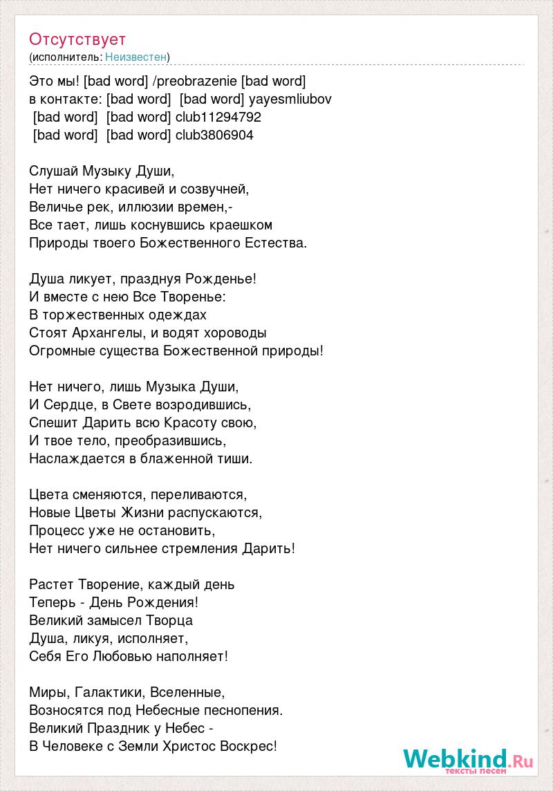 Это мы! [bad word] /preobrazenie [bad word] в контакте: [bad word] [bad word] yayesmliubov [bad word] [bad word] club11294792 [bad word] [bad word] club3806904 Слушай Музыку Души, Нет ничего красивей и созвучней, Величье рек, иллюзии времен,- Все тает, лишь коснувшись краешком Природы твоего Божественного Естества. Душа ликует, празднуя Рожденье! И вместе с нею Все Творенье: В торжественных одеждах Стоят Архангелы, и водят хороводы Огромные существа Божественной природы! Нет ничего, лишь Музыка Души, И Сердце, в Свете возродившись, Спешит Дарить всю Красоту свою, И твое тело, преобразившись, Наслаждается в блаженной тиши. Цвета сменяются, переливаются, Новые Цветы Жизни распускаются, Процесс уже не остановить, Нет ничего сильнее стремления Дарить! Растет Творение, каждый день Теперь - День Рождения! Великий замысел Творца Душа, ликуя, исполняет, Себя Его Любовью наполняет! Миры, Галактики, Вселенные, Возносятся под Небесные песнопения. Великий Праздник у Небес - В Человеке с Земли Христос Воскрес!