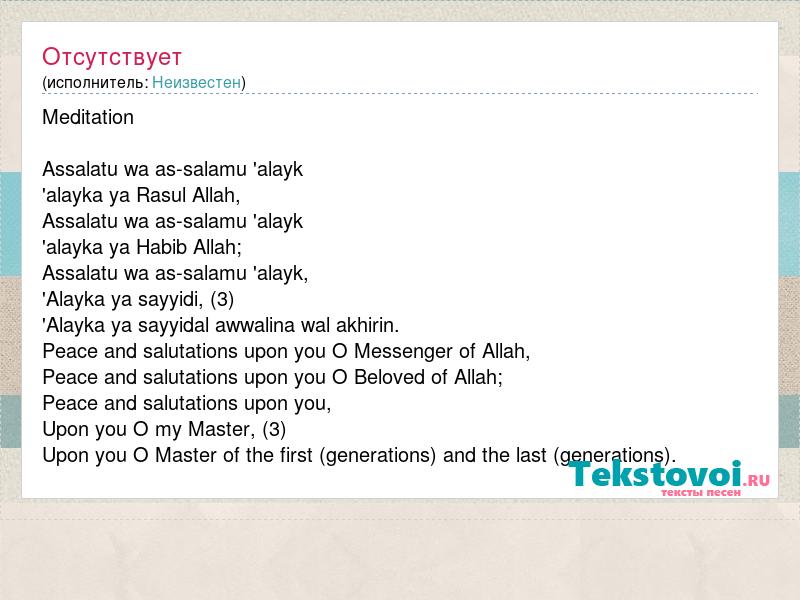 Meditation Assalatu wa as-salamu 'alayk 'alayka ya Rasul Allah, Assalatu wa as-salamu 'alayk 'alayka ya Habib Allah; Assalatu wa as-salamu 'alayk, 'Alayka ya sayyidi, (3) 'Alayka ya sayyidal awwalina wal akhirin. Peace and salutations upon you O Messenger of Allah, Peace and salutations upon you O Beloved of Allah; Peace and salutations upon you, Upon you O my Master, (3) Upon you O Master of the first (generations) and the last (generations).