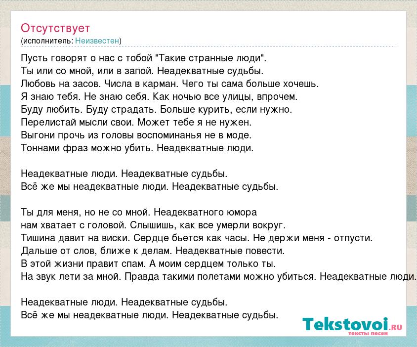 Пусть говорят о нас с тобой "Такие странные люди". Ты или со мной, или в запой. Неадекватные судьбы. Любовь на засов. Числа в карман. Чего ты сама больше хочешь. Я знаю тебя. Не знаю себя. Как ночью все улицы, впрочем. Буду любить. Буду страдать. Больше курить, если нужно. Перелистай мысли свои. Может тебе я не нужен. Выгони прочь из головы воспоминанья не в моде. Тоннами фраз можно убить. Неадекватные люди. Неадекватные люди. Неадекватные судьбы. Всё же мы неадекватные люди. Неадекватные судьбы. Ты для меня, но не со мной. Неадекватного юмора нам хватает с головой. Слышишь, как все умерли вокруг. Тишина давит на виски. Сердце бьется как часы. Не держи меня - отпусти. Дальше от слов, ближе к делам. Неадекватные повести. В этой жизни правит спам. А моим сердцем только ты. На звук лети за мной. Правда такими полетами можно убиться. Неадекватные люди. Неадекватные люди. Неадекватные судьбы. Всё же мы неадекватные люди. Неадекватные судьбы.