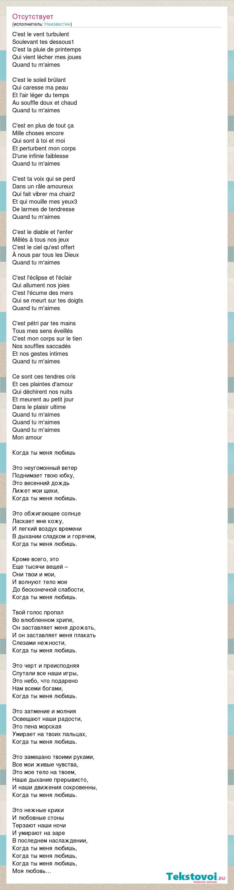 C'est le vent turbulent Soulevant tes dessous1 C'est la pluie de printemps Qui vient lécher mes joues Quand tu m'aimes C'est le soleil brûlant Qui caresse ma peau Et l'air léger du temps Au souffle doux et chaud Quand tu m'aimes C'est en plus de tout ça Mille choses encore Qui sont à toi et moi Et perturbent mon corps D'une infinie faiblesse Quand tu m'aimes C'est ta voix qui se perd Dans un râle amoureux Qui fait vibrer ma chair2 Et qui mouille mes yeux3 De larmes de tendresse Quand tu m'aimes C'est le diable et l'enfer Mêlés à tous nos jeux C'est le ciel qu'est offert À nous par tous les Dieux Quand tu m'aimes C'est l'éclipse et l'éclair Qui allument nos joies C'est l'écume des mers Qui se meurt sur tes doigts Quand tu m'aimes C'est pétri par tes mains Tous mes sens éveillés C'est mon corps sur le tien Nos souffles saccadés Et nos gestes intimes Quand tu m'aimes Ce sont ces tendres cris Et ces plaintes d'amour Qui déchirent nos nuits Et meurent au petit jour Dans le plaisir ultime Quand tu m'aimes Quand tu m'aimes Quand tu m'aimes Mon amour Когда ты меня любишь Это неугомонный ветер Поднимает твою юбку, Это весенний дождь Лижет мои щеки, Когда ты меня любишь. Это обжигающее солнце Ласкает мне кожу, И легкий воздух времени В дыхании сладком и горячем, Когда ты меня любишь. Кроме всего, это Еще тысячи вещей – Они твои и мои, И волнуют тело мое До бесконечной слабости, Когда ты меня любишь. Твой голос пропал Во влюбленном хрипе, Он заставляет меня дрожать, И он заставляет меня плакать Слезами нежности, Когда ты меня любишь. Это черт и преисподняя Спутали все наши игры, Это небо, что подарено Нам всеми богами, Когда ты меня любишь. Это затмение и молния Освещают наши радости, Это пена морская Умирает на твоих пальцах, Когда ты меня любишь. Это замешано твоими руками, Все мои живые чувства, Это мое тело на твоем, Наше дыхание прерывисто, И наши движения сокровенны, Когда ты меня любишь. Это нежные крики И любовные стоны Терзают наши ночи И умирают на заре В последнем наслаждении, Когда ты меня любишь, Когда ты меня любишь, Когда ты меня любишь, Моя любовь…