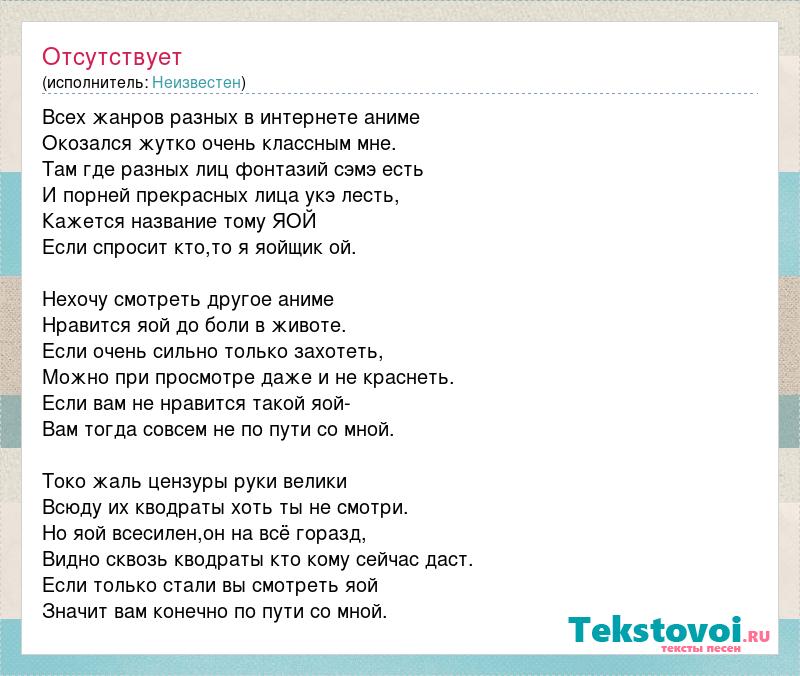 Всех жанров разных в интернете аниме Окозался жутко очень классным мне. Там где разных лиц фонтазий сэмэ есть И порней прекрасных лица укэ лесть, Кажется название тому ЯОЙ Если спросит кто,то я яойщик ой. Нехочу смотреть другое аниме Нравится яой до боли в животе. Если очень сильно только захотеть, Можно при просмотре даже и не краснеть. Если вам не нравится такой яой- Вам тогда совсем не по пути со мной. Токо жаль цензуры руки велики Всюду их кводраты хоть ты не смотри. Но яой всесилен,он на всё горазд, Видно сквозь кводраты кто кому сейчас даст. Если только стали вы смотреть яой Значит вам конечно по пути со мной.