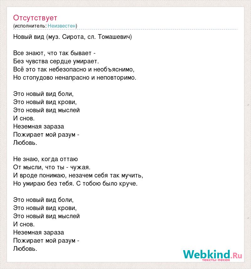 Новый вид (муз. Сирота, сл. Томашевич) Все знают, что так бывает - Без чувства сердце умирает. Всё это так небезопасно и необъяснимо, Но стопудово ненапрасно и неповторимо. Это новый вид боли, Это новый вид крови, Это новый вид мыслей И снов. Неземная зараза Пожирает мой разум - Любовь. Не знаю, когда оттаю От мысли, что ты - чужая. И вроде понимаю, незачем себя так мучить, Но умираю без тебя. С тобою было круче. Это новый вид боли, Это новый вид крови, Это новый вид мыслей И снов. Неземная зараза Пожирает мой разум - Любовь.
