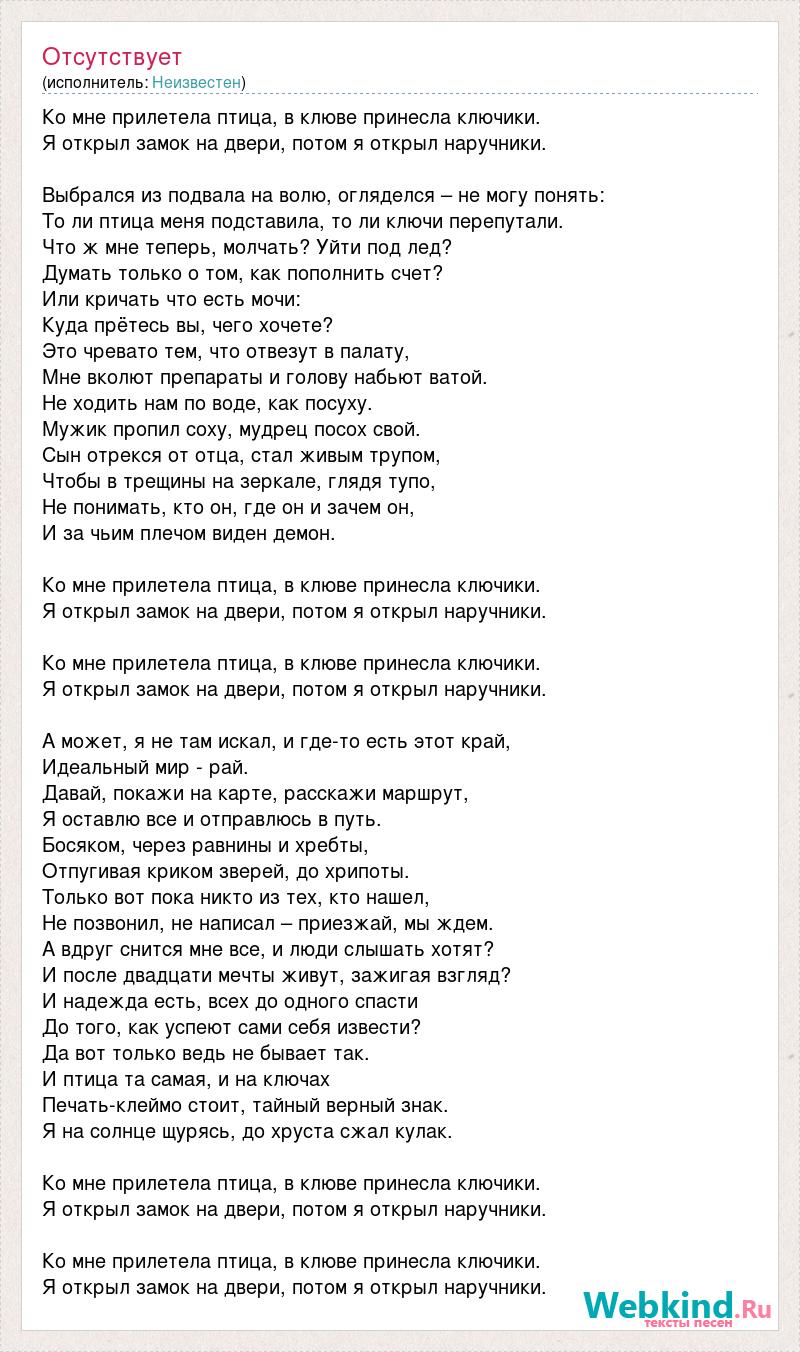 Ко мне прилетела птица, в клюве принесла ключики. Я открыл замок на двери, потом я открыл наручники. Выбрался из подвала на волю, огляделся – не могу понять: То ли птица меня подставила, то ли ключи перепутали. Что ж мне теперь, молчать? Уйти под лед? Думать только о том, как пополнить счет? Или кричать что есть мочи: Куда прётесь вы, чего хочете? Это чревато тем, что отвезут в палату, Мне вколют препараты и голову набьют ватой. Не ходить нам по воде, как посуху. Мужик пропил соху, мудрец посох свой. Сын отрекся от отца, стал живым трупом, Чтобы в трещины на зеркале, глядя тупо, Не понимать, кто он, где он и зачем он, И за чьим плечом виден демон. Ко мне прилетела птица, в клюве принесла ключики. Я открыл замок на двери, потом я открыл наручники. Ко мне прилетела птица, в клюве принесла ключики. Я открыл замок на двери, потом я открыл наручники. А может, я не там искал, и где-то есть этот край, Идеальный мир - рай. Давай, покажи на карте, расскажи маршрут, Я оставлю все и отправлюсь в путь. Босяком, через равнины и хребты, Отпугивая криком зверей, до хрипоты. Только вот пока никто из тех, кто нашел, Не позвонил, не написал – приезжай, мы ждем. А вдруг снится мне все, и люди слышать хотят? И после двадцати мечты живут, зажигая взгляд? И надежда есть, всех до одного спасти До того, как успеют сами себя извести? Да вот только ведь не бывает так. И птица та самая, и на ключах Печать-клеймо стоит, тайный верный знак. Я на солнце щурясь, до хруста сжал кулак. Ко мне прилетела птица, в клюве принесла ключики. Я открыл замок на двери, потом я открыл наручники. Ко мне прилетела птица, в клюве принесла ключики. Я открыл замок на двери, потом я открыл наручники.