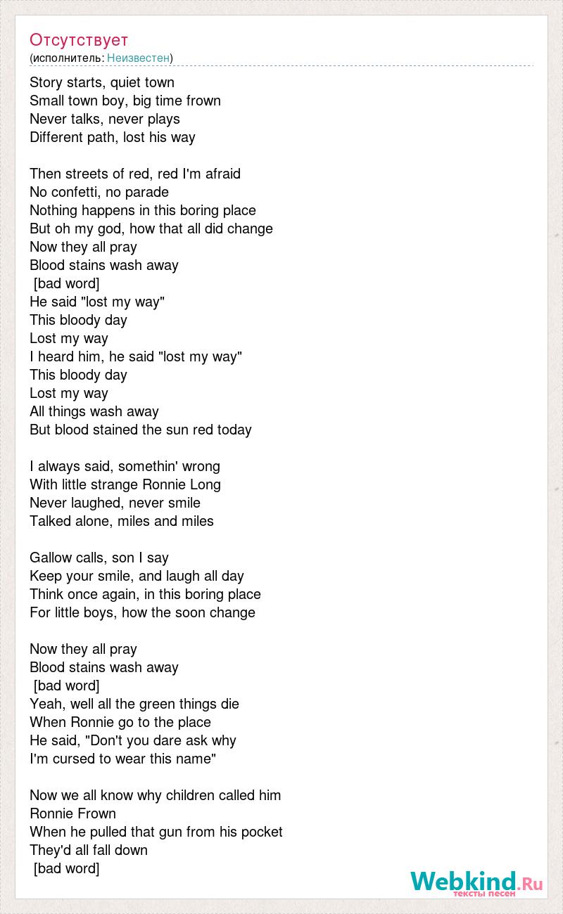 Story starts, quiet town Small town boy, big time frown Never talks, never plays Different path, lost his way Then streets of red, red I'm afraid No confetti, no parade Nothing happens in this boring place But oh my god, how that all did change Now they all pray Blood stains wash away [bad word] He said "lost my way" This bloody day Lost my way I heard him, he said "lost my way" This bloody day Lost my way All things wash away But blood stained the sun red today I always said, somethin' wrong With little strange Ronnie Long Never laughed, never smile Talked alone, miles and miles Gallow calls, son I say Keep your smile, and laugh all day Think once again, in this boring place For little boys, how the soon change Now they all pray Blood stains wash away [bad word] Yeah, well all the green things die When Ronnie go to the place He said, "Don't you dare ask why I'm cursed to wear this name" Now we all know why children called him Ronnie Frown When he pulled that gun from his pocket They'd all fall down [bad word]