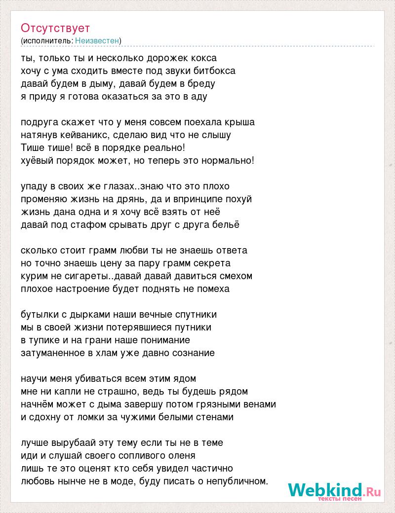 ты, только ты и несколько дорожек кокса хочу с ума сходить вместе под звуки битбокса давай будем в дыму, давай будем в бреду я приду я готова оказаться за это в аду подруга скажет что у меня совсем поехала крыша натянув кейваникс, сделаю вид что не слышу Тише тише! всё в порядке реально! хуёвый порядок может, но теперь это нормально! упаду в своих же глазах..знаю что это плохо променяю жизнь на дрянь, да и впринципе похуй жизнь дана одна и я хочу всё взять от неё давай под стафом срывать друг с друга бельё сколько стоит грамм любви ты не знаешь ответа но точно знаешь цену за пару грамм секрета курим не сигареты..давай давай давиться смехом плохое настроение будет поднять не помеха бутылки с дырками наши вечные спутники мы в своей жизни потерявшиеся путники в тупике и на грани наше понимание затуманенное в хлам уже давно сознание научи меня убиваться всем этим ядом мне ни капли не страшно, ведь ты будешь рядом начнём может с дыма завершу потом грязными венами и сдохну от ломки за чужими белыми стенами лучше вырубаай эту тему если ты не в теме иди и слушай своего сопливого оленя лишь те это оценят кто себя увидел частично любовь нынче не в моде, буду писать о непубличном.