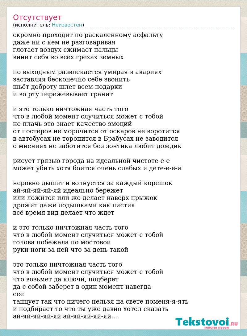 скромно проходит по раскаленному асфальту даже ни с кем не разговаривая глотает воздух сжимает пальцы винит себя во всех грехах земных по выходным развлекается умирая в авариях заставляя бесконечно себе звонить шьёт доброту шлет всем подарки и во рту пережевывает гранит и это только ничтожная часть того что в любой момент случиться может с тобой не плачь это знает качество эмоций от постеров не морочится от оскаров не воротится в автобусах не торопится в Брабусах не заводится о мнениях не заботится без зонтика любит дождик рисует грязью города на идеальной чистоте-е-е может убить хотя боится очень слабых и дете-е-е-й неровно дышит и волнуется за каждый корешок ай-яй-яй-яй-яй идеально бережет или ложится или же делает наверх прыжок дрожит даже лодышками как листик всё время вид делает что ждет и это только ничтожная часть того что в любой момент случиться может с тобой голова побежала по мостовой руки-ноги за ней что за день такой это только ничтожная часть того что в любой момент случиться может с тобой что возьмет да ключи, подберет да с собой заберет в один момент навегда еее танцует так что ничего нельзя на свете поменя-я-ять и подбирает то что ты уже давно хотел сказать ай-яй-яй-яй-яй ай-яй-яй-яй-яй....