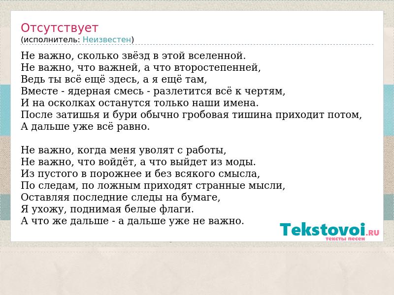 Не важно, сколько звёзд в этой вселенной. Не важно, что важней, а что второстепенней, Ведь ты всё ещё здесь, а я ещё там, Вместе - ядерная смесь - разлетится всё к чертям, И на осколках останутся только наши имена. После затишья и бури обычно гробовая тишина приходит потом, А дальше уже всё равно. Не важно, когда меня уволят с работы, Не важно, что войдёт, а что выйдет из моды. Из пустого в порожнее и без всякого смысла, По следам, по ложным приходят странные мысли, Оставляя последние следы на бумаге, Я ухожу, поднимая белые флаги. А что же дальше - а дальше уже не важно.