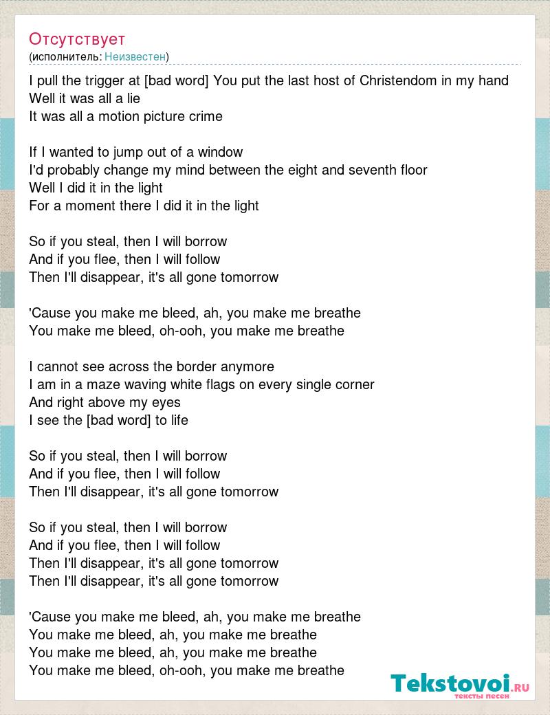 I pull the trigger at [bad word] You put the last host of Christendom in my hand Well it was all a lie It was all a motion picture crime If I wanted to jump out of a window I'd probably change my mind between the eight and seventh floor Well I did it in the light For a moment there I did it in the light So if you steal, then I will borrow And if you flee, then I will follow Then I'll disappear, it's all gone tomorrow 'Cause you make me bleed, ah, you make me breathe You make me bleed, oh-ooh, you make me breathe I cannot see across the border anymore I am in a maze waving white flags on every single corner And right above my eyes I see the [bad word] to life So if you steal, then I will borrow And if you flee, then I will follow Then I'll disappear, it's all gone tomorrow So if you steal, then I will borrow And if you flee, then I will follow Then I'll disappear, it's all gone tomorrow Then I'll disappear, it's all gone tomorrow 'Cause you make me bleed, ah, you make me breathe You make me bleed, ah, you make me breathe You make me bleed, ah, you make me breathe You make me bleed, oh-ooh, you make me breathe