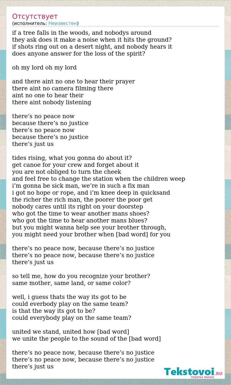 if a tree falls in the woods, and nobodys around they ask does it make a noise when it hits the ground? if shots ring out on a desert night, and nobody hears it does anyone answer for the loss of the spirit? oh my lord oh my lord and there aint no one to hear their prayer there aint no camera filming there aint no one to hear their there aint nobody listening there’s no peace now because there’s no justice there’s no peace now because there’s no justice there’s just us tides rising, what you gonna do about it? get canoe for your crew and forget about it you are not obliged to turn the cheek and feel free to change the station when the children weep i’m gonna be sick man, we’re in such a fix man i got no hope or rope, and i’m knee deep in quicksand the richer the rich man, the poorer the poor get nobody cares until its right on your doorstep who got the time to wear another mans shoes? who got the time to hear another mans blues? but you might wanna help see your brother through, you might need your brother when [bad word] for you there’s no peace now, because there’s no justice there’s no peace now, because there’s no justice there’s just us so tell me, how do you recognize your brother? same mother, same land, or same color? well, i guess thats the way its got to be could everbody play on the same team? is that the way its got to be? could everybody play on the same team? united we stand, united how [bad word] we unite the people to the sound of the [bad word] there’s no peace now, because there’s no justice there’s no peace now, because there’s no justice there’s just us