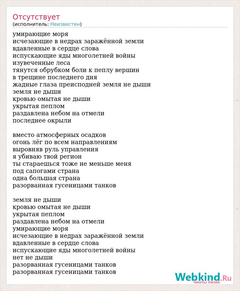 умирающие моря исчезающие в недрах заражённой земли вдавленные в сердце слова испускающие яды многолетней войны изувеченные леса тянутся обрубком боли к пеплу вершин в трещине последнего дня жадные глаза преисподней земля не дыши земля не дыши кровью омытая не дыши укрытая пеплом раздавлена небом на отмели последнее окрыли вместо атмосферных осадков огонь лёг по всем направлениям выровняв руль управления я убиваю твой регион ты стараешься тоже не меньше меня под сапогами страна одна большая страна разорванная гусеницами танков земля не дыши кровью омытая не дыши укрытая пеплом раздавлена небом на отмели умирающие моря исчезающие в недрах заражённой земли вдавленные в сердце слова испускающие яды многолетней войны нет не дыши разорванная гусеницами танков разорванная гусеницами танков