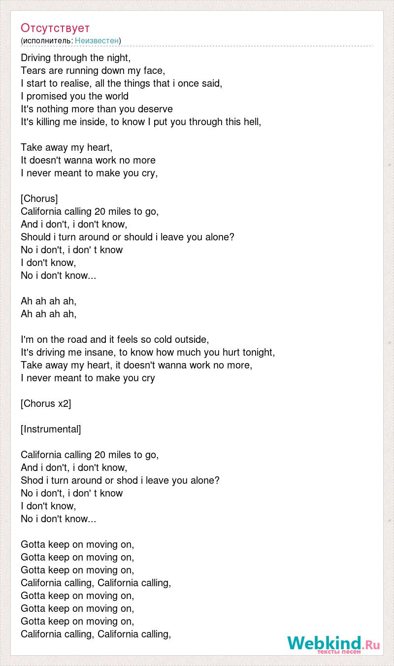 Driving through the night, Tears [bad word] down my face, I start to realise, all the things that i once said, I promised you the world It's nothing more than you deserve It's killing me inside, to know I put you through this [bad word] Take away my heart, It doesn't wanna work no more I never meant to make you cry, [bad word] California calling 20 miles to go, And i don't, i don't know, Should i turn around or should i leave you alone? No i don't, i don' t know I don't know, No i don't know... Ah ah ah ah, Ah ah ah ah, I'm on the road and it feels so cold outside, It's driving me insane, to know how much you hurt tonight, Take away my heart, it doesn't wanna work no more, I never meant to make you cry [bad word] x2] [bad word] California calling 20 miles to go, And i don't, i don't know, Shod i turn around or shod i leave you alone? No i don't, i don' t know I don't know, No i don't know... Gotta keep on moving on, Gotta keep on moving on, Gotta keep on moving on, California calling, California calling, Gotta keep on moving on, Gotta keep on moving on, Gotta keep on moving on, California calling, California calling,
