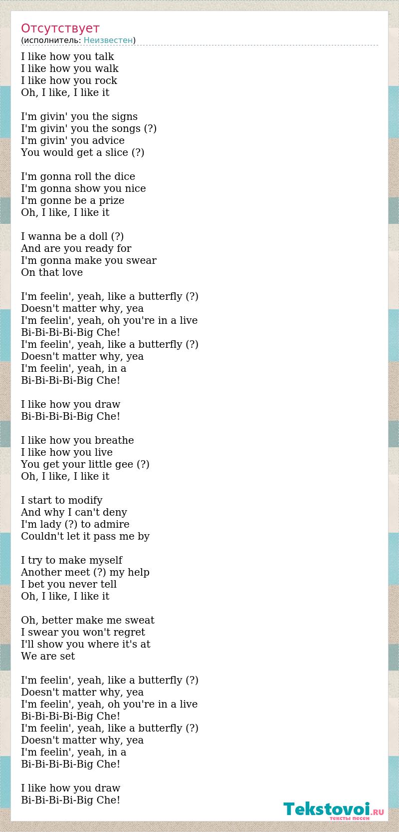 I like how you talk I like how you walk I like how you rock Oh, I like, I like it I'm givin' you the signs I'm givin' you the songs (?) I'm givin' you advice You would get a slice (?) I'm gonna roll the dice I'm gonna show you nice I'm gonne be a prize Oh, I like, I like it I wanna be a doll (?) And are you ready for I'm gonna make you swear On that love I'm feelin', yeah, like a butterfly (?) Doesn't matter why, yea I'm feelin', yeah, oh you're in a live Bi-Bi-Bi-Bi-Big Che! I'm feelin', yeah, like a butterfly (?) Doesn't matter why, yea I'm feelin', yeah, in a Bi-Bi-Bi-Bi-Big Che! I like how you draw Bi-Bi-Bi-Bi-Big Che! I like how you breathe I like how you live You get your little gee (?) Oh, I like, I like it I start to modify And why I can't deny I'm lady (?) to admire Couldn't let it pass me by I try to make myself Another meet (?) my help I bet you never tell Oh, I like, I like it Oh, better make me sweat I swear you won't regret I'll show you where it's at We are set I'm feelin', yeah, like a butterfly (?) Doesn't matter why, yea I'm feelin', yeah, oh you're in a live Bi-Bi-Bi-Bi-Big Che! I'm feelin', yeah, like a butterfly (?) Doesn't matter why, yea I'm feelin', yeah, in a Bi-Bi-Bi-Bi-Big Che! I like how you draw Bi-Bi-Bi-Bi-Big Che!