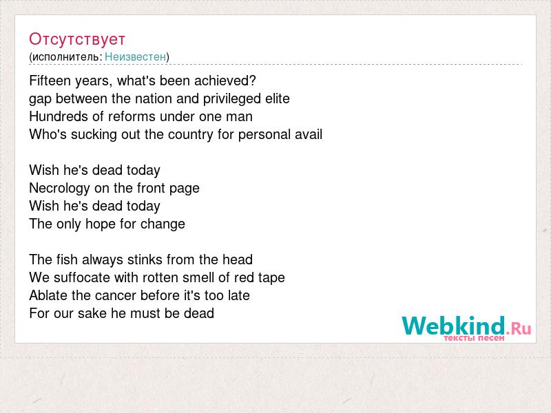 Fifteen years, what's been achieved? gap between the nation and privileged elite Hundreds of reforms under one man Who's sucking out the country for personal avail Wish he's dead today Necrology on the front page Wish he's dead today The only hope for change The fish always stinks from the head We suffocate with rotten smell of red tape Ablate the cancer before it's too late For our sake he must be dead