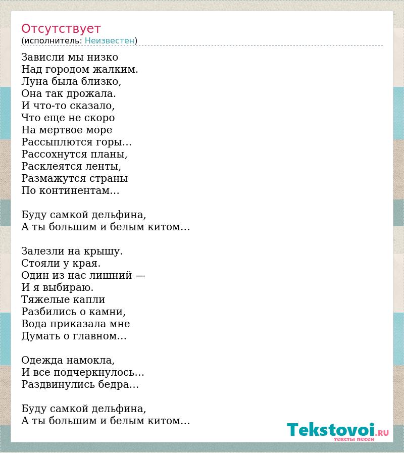 Зависли мы низко Над городом жалким. Луна была близко, Она так дрожала. И что-то сказало, Что еще не скоро На мертвое море Рассыплются горы… Рассохнутся планы, Расклеятся ленты, Размажутся страны По континентам… Буду самкой дельфина, А ты большим и белым китом… Залезли на крышу. Стояли у края. Один из нас лишний — И я выбираю. Тяжелые капли Разбились о камни, Вода приказала мне Думать о главном… Одежда намокла, И все подчеркнулось… Раздвинулись бедра… Буду самкой дельфина, А ты большим и белым китом…