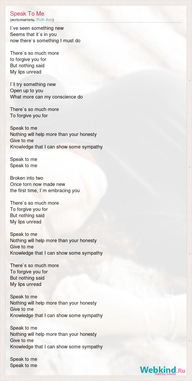 I`ve seen something new Seems that it`s in you now there`s something I must do There`s so much more to forgive you for But nothing said My lips unread I`ll try something new Open up to you What more can my conscience do There`s so much more To forgive you for Speak to me Nothing will help more than your honesty Give to me Knowledge that I can show some sympathy Speak to me Speak to me Broken into two Once torn now made new the first time, I`m embracing you There`s so much more To forgive you for But nothing said My lips unread Speak to me Nothing will help more than your honesty Give to me Knowledge that I can show some sympathy There`s so much more To forgive you for But nothing said My lips unread Speak to me Nothing will help more than your honesty Give to me Knowledge that I can show some sympathy Speak to me Nothing will help more than your honesty Give to me Knowledge that I can show some sympathy Speak to me Speak to me