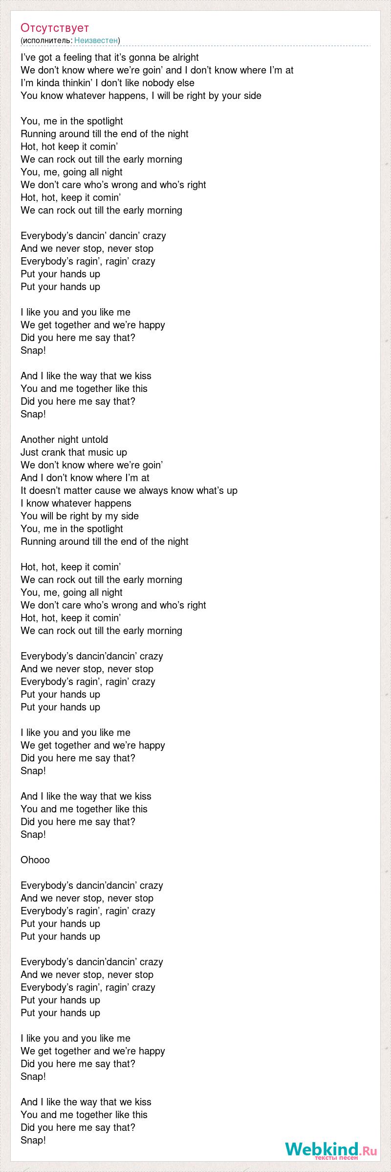 I’ve got a feeling that it’s gonna be alright We don’t know where we’re goin’ and I don’t know where I’m at I’m kinda thinkin’ I don’t like nobody else You know whatever happens, I will be right by your side You, me in the [bad word] around till the end of the night Hot, hot keep [bad word] We can rock out till the early morning You, me, going all night We don’t care who’s wrong and who’s right Hot, hot, keep [bad word] We can rock out till the early morning Everybody’s dancin’ dancin’ crazy And we never stop, never stop Everybody’s ragin’, ragin’ crazy Put your hands up Put your hands up I like you and you like me We get together and we’re happy Did you here me say that? Snap! And I like the way that we kiss You and me together like this Did you here me say that? Snap! Another night untold Just crank that music up We don’t know where we’re goin’ And I don’t know where I’m at It doesn’t matter cause we always know what’s up I know whatever happens You will be right by my side You, me in the [bad word] around till the end of the night Hot, hot, keep [bad word] We can rock out till the early morning You, me, going all night We don’t care who’s wrong and who’s right Hot, hot, keep [bad word] We can rock out till the early morning Everybody’s dancin’dancin’ crazy And we never stop, never stop Everybody’s ragin’, ragin’ crazy Put your hands up Put your hands up I like you and you like me We get together and we’re happy Did you here me say that? Snap! And I like the way that we kiss You and me together like this Did you here me say that? Snap! Ohooo Everybody’s dancin’dancin’ crazy And we never stop, never stop Everybody’s ragin’, ragin’ crazy Put your hands up Put your hands up Everybody’s dancin’dancin’ crazy And we never stop, never stop Everybody’s ragin’, ragin’ crazy Put your hands up Put your hands up I like you and you like me We get together and we’re happy Did you here me say that? Snap! And I like the way that we kiss You and me together like this Did you here me say that? Snap!