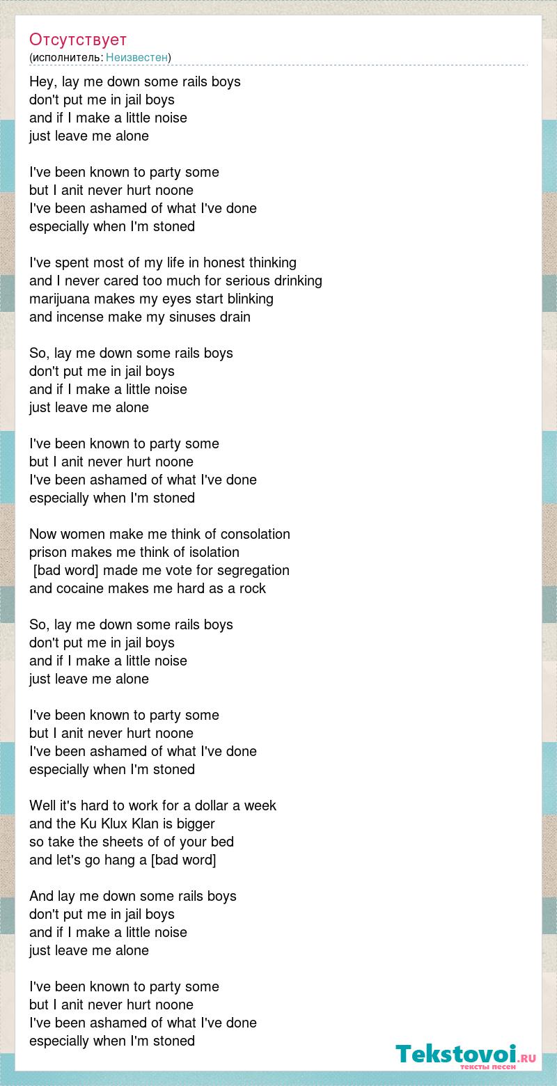 Hey, lay me down some rails boys don't put me in jail boys and if I make a little noise just leave me alone I've been known to party some but I anit never hurt noone I've been ashamed of what I've done especially when I'm stoned I've spent most of my life in honest thinking and I never cared too much for serious drinking marijuana makes my eyes start blinking and incense make my sinuses drain So, lay me down some rails boys don't put me in jail boys and if I make a little noise just leave me alone I've been known to party some but I anit never hurt noone I've been ashamed of what I've done especially when I'm stoned Now women make me think of consolation prison makes me think of isolation [bad word] made me vote for segregation and cocaine makes me hard as a rock So, lay me down some rails boys don't put me in jail boys and if I make a little noise just leave me alone I've been known to party some but I anit never hurt noone I've been ashamed of what I've done especially when I'm stoned Well it's hard to work for a dollar a week and the Ku Klux Klan is bigger so take the sheets of of your bed and let's go hang a [bad word] And lay me down some rails boys don't put me in jail boys and if I make a little noise just leave me alone I've been known to party some but I anit never hurt noone I've been ashamed of what I've done especially when I'm stoned