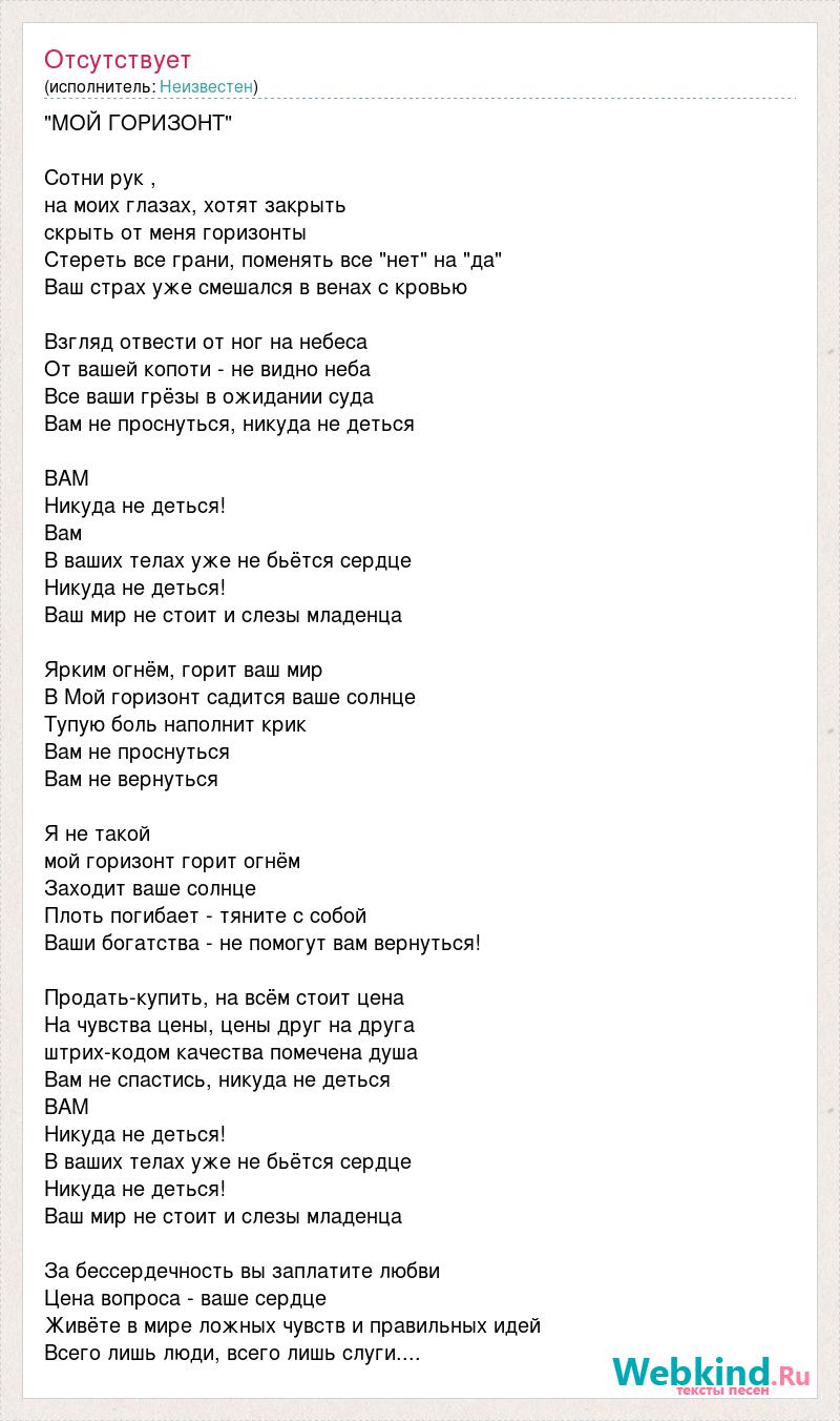 "МОЙ ГОРИЗОНТ" Сотни рук , на моих глазах, хотят закрыть скрыть от меня горизонты Стереть все грани, поменять все "нет" на "да" Ваш страх уже смешался в венах с кровью Взгляд отвести от ног на небеса От вашей копоти - не видно неба Все ваши грёзы в ожидании суда Вам не проснуться, никуда не деться ВАМ Никуда не деться! Вам В ваших телах уже не бьётся сердце Никуда не деться! Ваш мир не стоит и слезы младенца Ярким огнём, горит ваш мир В Мой горизонт садится ваше солнце Тупую боль наполнит крик Вам не проснуться Вам не вернуться Я не такой мой горизонт горит огнём Заходит ваше солнце Плоть погибает - тяните с собой Ваши богатства - не помогут вам вернуться! Продать-купить, на всём стоит цена На чувства цены, цены друг на друга штрих-кодом качества помечена душа Вам не спастись, никуда не деться ВАМ Никуда не деться! В ваших телах уже не бьётся сердце Никуда не деться! Ваш мир не стоит и слезы младенца За бессердечность вы заплатите любви Цена вопроса - ваше сердце Живёте в мире ложных чувств и правильных идей Всего лишь люди, всего лишь слуги....