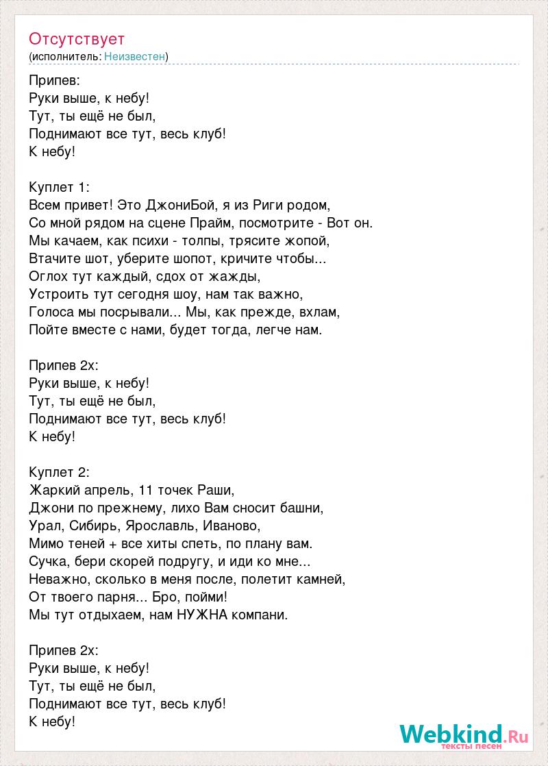Припев: Руки выше, к небу! Тут, ты ещё не был, Поднимают все тут, весь клуб! К небу! Куплет 1: Всем привет! Это ДжониБой, я из Риги родом, Со мной рядом на сцене Прайм, посмотрите - Вот он. Мы качаем, как психи - толпы, трясите жопой, Втачите шот, уберите шопот, кричите чтобы... Оглох тут каждый, сдох от жажды, Устроить тут сегодня шоу, нам так важно, Голоса мы посрывали... Мы, как прежде, вхлам, Пойте вместе с нами, будет тогда, легче нам. Припев 2х: Руки выше, к небу! Тут, ты ещё не был, Поднимают все тут, весь клуб! К небу! Куплет 2: Жаркий апрель, 11 точек Раши, Джони по прежнему, лихо Вам сносит башни, Урал, Сибирь, Ярославль, Иваново, Мимо теней + все хиты спеть, по плану вам. Сучка, бери скорей подругу, и иди ко мне... Неважно, сколько в меня после, полетит камней, От твоего парня... Бро, пойми! Мы тут отдыхаем, нам НУЖНА компани. Припев 2х: Руки выше, к небу! Тут, ты ещё не был, Поднимают все тут, весь клуб! К небу!