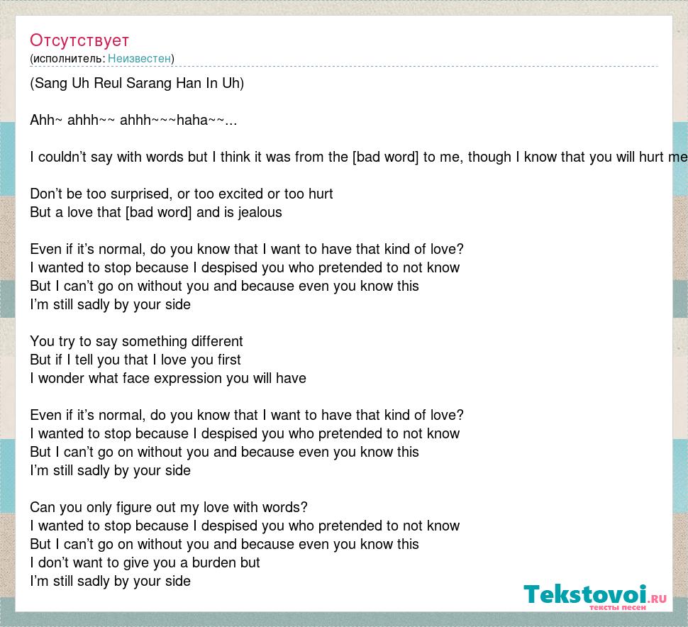 (Sang Uh Reul Sarang Han In Uh) Ahh~ ahhh~~ ahhh~~~haha~~... I couldn’t say with words but I think it was from the [bad word] to me, though I know that you will hurt me Don’t be too surprised, or too excited or too hurt But a love that [bad word] and is jealous Even if it’s normal, do you know that I want to have that kind of love? I wanted to stop because I despised you who pretended to not know But I can’t go on without you and because even you know this I’m still sadly by your side You try to say something different But if I tell you that I love you first I wonder what face expression you will have Even if it’s normal, do you know that I want to have that kind of love? I wanted to stop because I despised you who pretended to not know But I can’t go on without you and because even you know this I’m still sadly by your side Can you only figure out my love with words? I wanted to stop because I despised you who pretended to not know But I can’t go on without you and because even you know this I don’t want to give you a burden but I’m still sadly by your side
