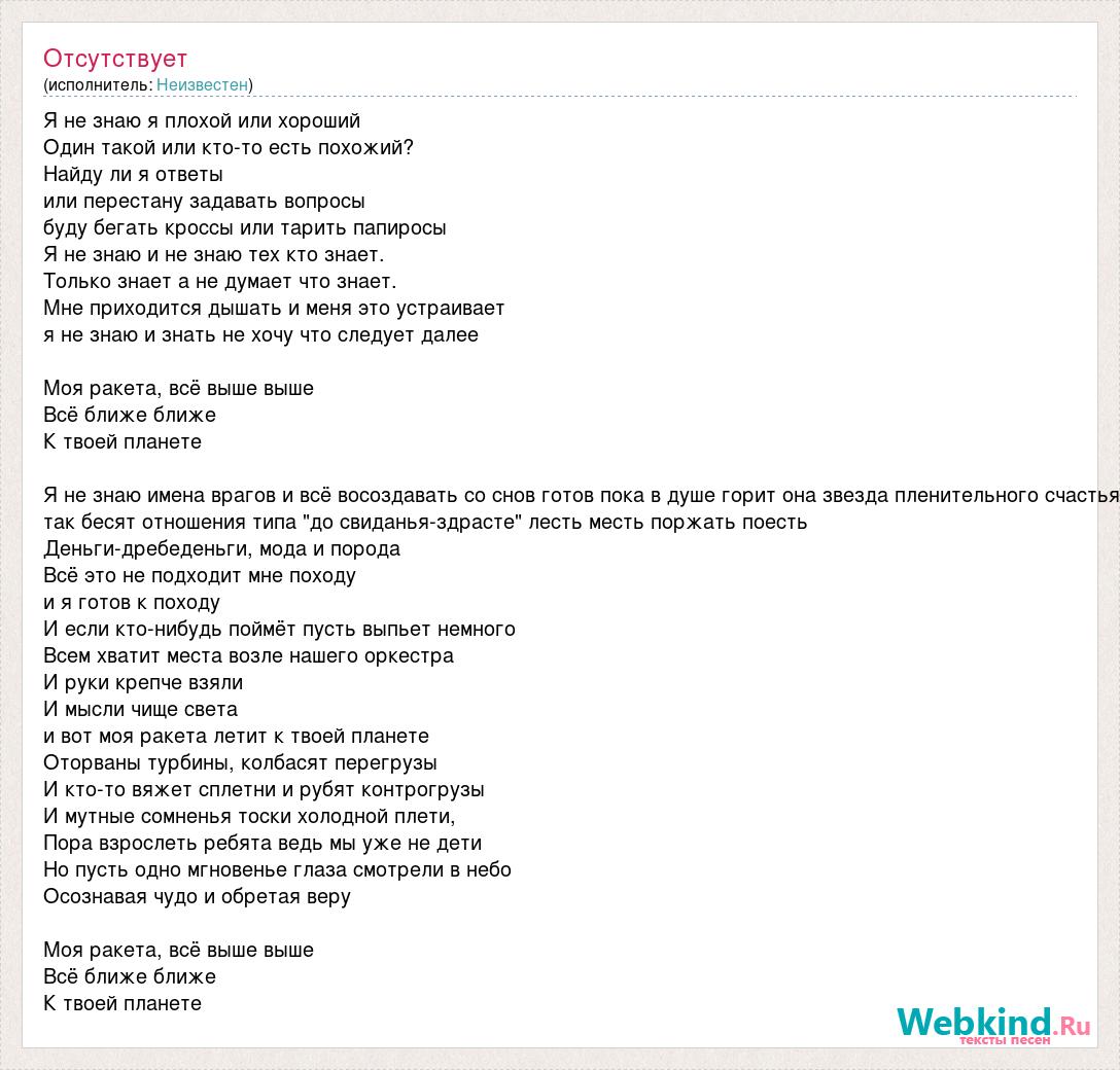 Я не знаю я плохой или хороший Один такой или кто-то есть похожий? Найду ли я ответы или перестану задавать вопросы буду бегать кроссы или тарить папиросы Я не знаю и не знаю тех кто знает. Только знает а не думает что знает. Мне приходится дышать и меня это устраивает я не знаю и знать не хочу что следует далее Моя ракета, всё выше выше Всё ближе ближе К твоей планете Я не знаю имена врагов и всё восоздавать со снов готов пока в душе горит она звезда пленительного счастья так бесят отношения типа "до свиданья-здрасте" лесть месть поржать поесть Деньги-дребеденьги, мода и порода Всё это не подходит мне походу и я готов к походу И если кто-нибудь поймёт пусть выпьет немного Всем хватит места возле нашего оркестра И руки крепче взяли И мысли чище света и вот моя ракета летит к твоей планете Оторваны турбины, колбасят перегрузы И кто-то вяжет сплетни и рубят контрогрузы И мутные сомненья тоски холодной плети, Пора взрослеть ребята ведь мы уже не дети Но пусть одно мгновенье глаза смотрели в небо Осознавая чудо и обретая веру Моя ракета, всё выше выше Всё ближе ближе К твоей планете