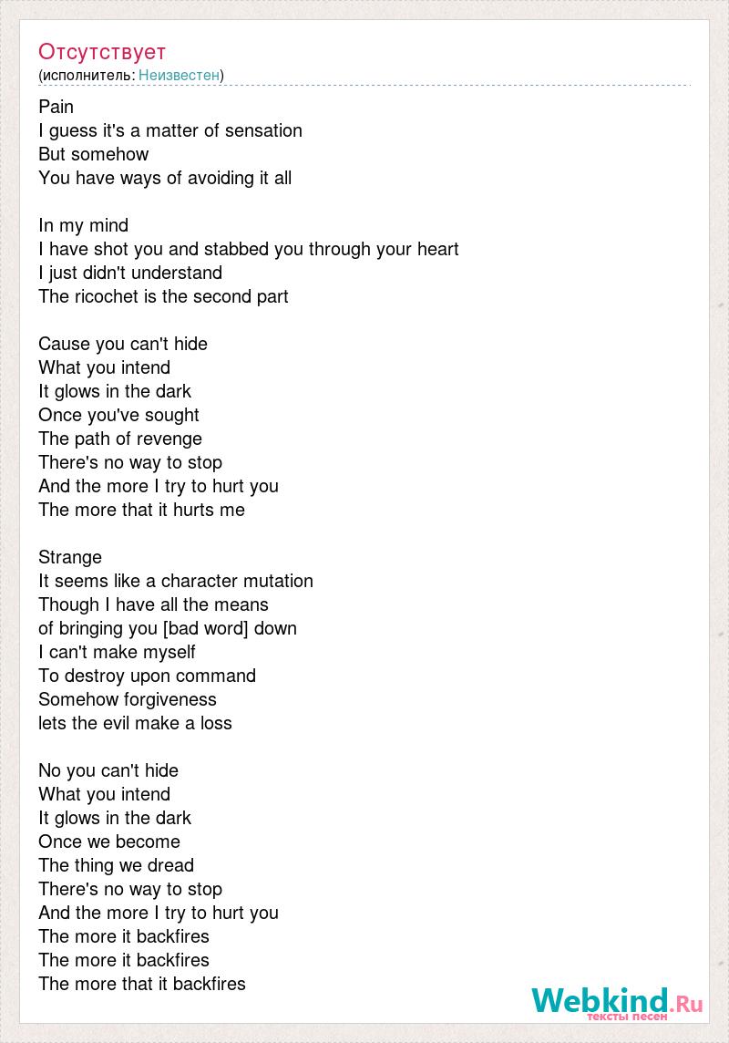 Pain I guess it's a matter of sensation But somehow You have ways of avoiding it all In my mind I have shot you and stabbed you through your heart I just didn't understand The ricochet is the second part Cause you can't hide What you intend It glows in the dark Once you've sought The path of revenge There's no way to stop And the more I try to hurt you The more that it hurts me Strange It seems like a character mutation Though I have all the means of bringing you [bad word] down I can't make myself To destroy [bad word] Somehow forgiveness lets the evil make a loss No you can't hide What you intend It glows in the dark Once we [bad word] The thing we dread There's no way to stop And the more I try to hurt you The more it backfires The more it backfires The more that it backfires