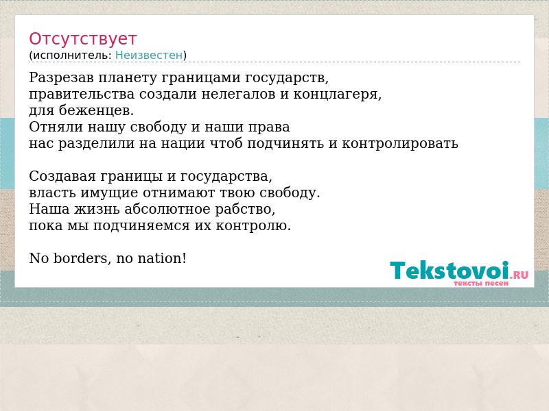 Разрезав планету границами государств, правительства создали нелегалов и концлагеря, для беженцев. Отняли нашу свободу и наши права нас разделили на нации чтоб подчинять и контролировать Создавая границы и государства, власть имущие отнимают твою свободу. Наша жизнь абсолютное рабство, пока мы подчиняемся их контролю. No borders, no nation!