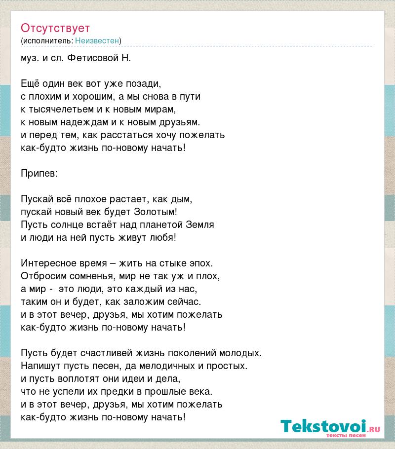 муз. и сл. Фетисовой Н. Ещё один век вот уже позади, с плохим и хорошим, а мы снова в пути к тысячелетьем и к новым мирам, к новым надеждам и к новым друзьям. и перед тем, как расстаться хочу пожелать как-будто жизнь по-новому начать! Припев: Пускай всё плохое растает, как дым, пускай новый век будет Золотым! Пусть солнце встаёт над планетой Земля и люди на ней пусть живут любя! Интересное время – жить на стыке эпох. Отбросим сомненья, мир не так уж и плох, а мир - это люди, это каждый из нас, таким он и будет, как заложим сейчас. и в этот вечер, друзья, мы хотим пожелать как-будто жизнь по-новому начать! Пусть будет счастливей жизнь поколений молодых. Напишут пусть песен, да мелодичных и простых. и пусть воплотят они идеи и дела, что не успели их предки в прошлые века. и в этот вечер, друзья, мы хотим пожелать как-будто жизнь по-новому начать!