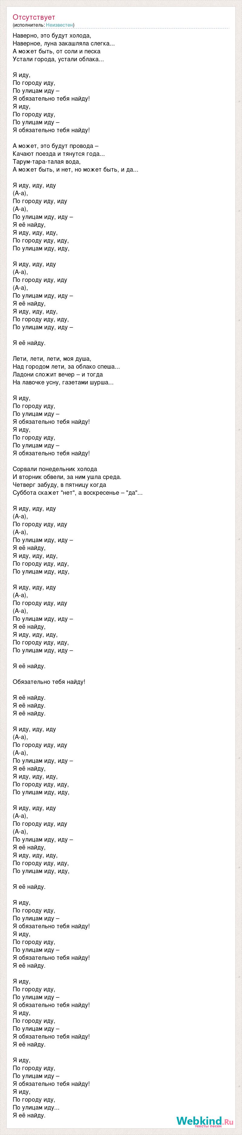 Наверно, это будут холода, Наверное, луна закашляла слегка... А может быть, от соли и песка Устали города, устали облака... Я иду, По городу иду, По улицам иду – Я обязательно тебя найду! Я иду, По городу иду, По улицам иду – Я обязательно тебя найду! А может, это будут провода – Качают поезда и тянутся года... Тарум-тара-талая вода, А может быть, и нет, но может быть, и да... Я иду, иду, иду (А-а), По городу иду, иду (А-а), По улицам иду, иду – Я её найду, Я иду, иду, иду, По городу иду, иду, По улицам иду, иду, Я иду, иду, иду (А-а), По городу иду, иду (А-а), По улицам иду, иду – Я её найду, Я иду, иду, иду, По городу иду, иду, По улицам иду, иду – Я её найду. Лети, лети, лети, моя душа, Над городом лети, за облако спеша... Ладони сложит вечер – и тогда На лавочке усну, газетами шурша... Я иду, По городу иду, По улицам иду – Я обязательно тебя найду! Я иду, По городу иду, По улицам иду – Я обязательно тебя найду! Сорвали понедельник холода И вторник обвели, за ним ушла среда. Четверг забуду, в пятницу когда Суббота скажет "нет", а воскресенье – "да"... Я иду, иду, иду (А-а), По городу иду, иду (А-а), По улицам иду, иду – Я её найду, Я иду, иду, иду, По городу иду, иду, По улицам иду, иду, Я иду, иду, иду (А-а), По городу иду, иду (А-а), По улицам иду, иду – Я её найду, Я иду, иду, иду, По городу иду, иду, По улицам иду, иду – Я её найду. Обязательно тебя найду! Я её найду. Я её найду. Я её найду. Я иду, иду, иду (А-а), По городу иду, иду (А-а), По улицам иду, иду – Я её найду, Я иду, иду, иду, По городу иду, иду, По улицам иду, иду, Я иду, иду, иду (А-а), По городу иду, иду (А-а), По улицам иду, иду – Я её найду, Я иду, иду, иду, По городу иду, иду, По улицам иду, иду, Я её найду. Я иду, По городу иду, По улицам иду – Я обязательно тебя найду! Я иду, По городу иду, По улицам иду – Я обязательно тебя найду! Я её найду. Я иду, По городу иду, По улицам иду – Я обязательно тебя найду! Я иду, По городу иду, По улицам иду – Я обязательно тебя найду! Я её найду. Я иду, По городу иду, По улицам иду – Я обязательно тебя найду! Я иду, По городу иду, По улицам иду... Я её найду.