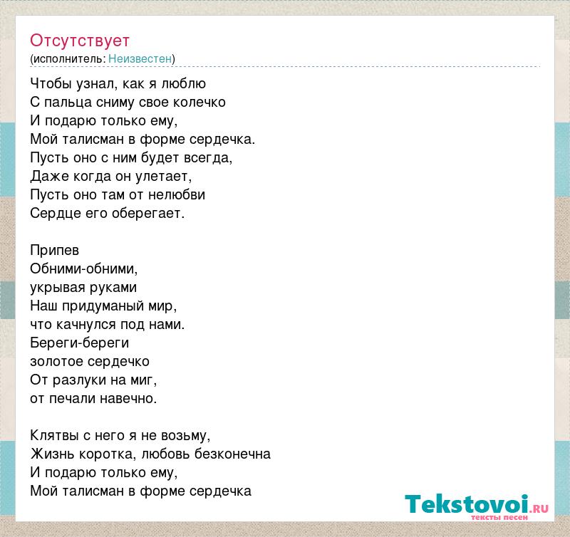 Чтобы узнал, как я люблю С пальца сниму свое колечко И подарю только ему, Мой талисман в форме сердечка. Пусть оно с ним будет всегда, Даже когда он улетает, Пусть оно там от нелюбви Сердце его оберегает. Припев Обними-обними, укрывая руками Наш придуманый мир, что качнулся под нами. Береги-береги золотое сердечко От разлуки на миг, от печали навечно. Клятвы с него я не возьму, Жизнь коротка, любовь безконечна И подарю только ему, Мой талисман в форме сердечка