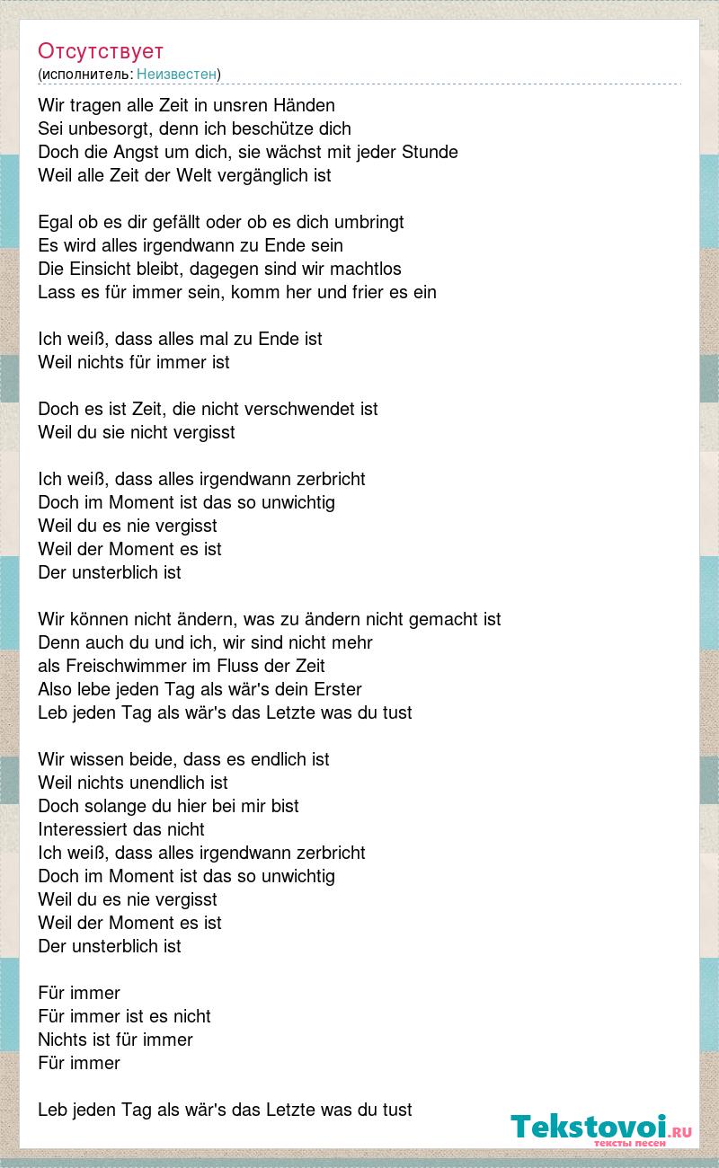 Wir tragen alle Zeit in unsren Händen Sei unbesorgt, denn ich beschütze dich Doch die Angst um dich, sie wächst mit jeder Stunde Weil alle Zeit der Welt vergänglich ist Egal ob es dir gefällt oder ob es dich umbringt Es wird alles irgendwann zu Ende sein Die Einsicht bleibt, dagegen sind wir machtlos Lass es für immer sein, komm her und frier es ein Ich weiß, dass alles mal zu Ende ist Weil nichts für immer ist Doch es ist Zeit, die nicht verschwendet ist Weil du sie nicht vergisst Ich weiß, dass alles irgendwann zerbricht Doch im Moment ist das so unwichtig Weil du es nie vergisst Weil der Moment es ist Der unsterblich ist Wir können nicht ändern, was zu ändern nicht gemacht ist Denn auch du und ich, wir sind nicht mehr als Freischwimmer im Fluss der Zeit Also lebe jeden Tag als wär's dein Erster Leb jeden Tag als wär's das Letzte was du tust Wir wissen beide, dass es endlich ist Weil nichts unendlich ist Doch solange du hier bei mir bist Interessiert das nicht Ich weiß, dass alles irgendwann zerbricht Doch im Moment ist das so unwichtig Weil du es nie vergisst Weil der Moment es ist Der unsterblich ist Für immer Für immer ist es nicht Nichts ist für immer Für immer Leb jeden Tag als wär's das Letzte was du tust