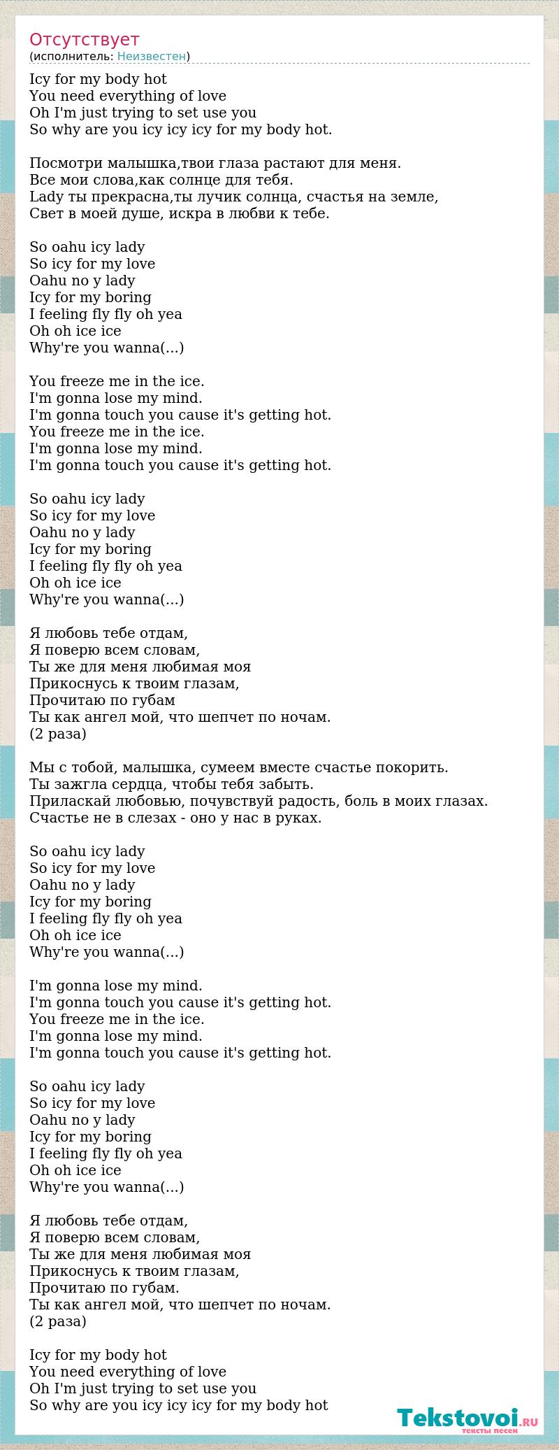 Icy for my body hot You need everything of love Oh I'm just trying to set use you So why are you icy icy icy for my body hot. Посмотри малышка,твои глаза растают для меня. Все мои слова,как солнце для тебя. Lady ты прекрасна,ты лучик солнца, счастья на земле, Свет в моей душе, искра в любви к тебе. So оahu icy lady So icy for my love Oahu no y lady Icy for my boring I feeling fly fly oh yea Oh oh ice ice Why're you wanna(...) You freeze me in the ice. I'm gonna lose my mind. I'm gonna touch you cause it's getting hot. You freeze me in the ice. I'm gonna lose my mind. I'm gonna touch you cause it's getting hot. So оahu icy lady So icy for my love Oahu no y lady Icy for my boring I feeling fly fly oh yea Oh oh ice ice Why're you wanna(...) Я любовь тебе отдам, Я поверю всем словам, Ты же для меня любимая моя Прикоснусь к твоим глазам, Прочитаю по губам Ты как ангел мой, что шепчет по ночам. (2 раза) Мы с тобой, малышка, сумеем вместе счастье покорить. Ты зажгла сердца, чтобы тебя забыть. Приласкай любовью, почувствуй радость, боль в моих глазах. Счастье не в слезах - оно у нас в руках. So оahu icy lady So icy for my love Oahu no y lady Icy for my boring I feeling fly fly oh yea Oh oh ice ice Why're you wanna(...) I'm gonna lose my mind. I'm gonna touch you cause it's getting hot. You freeze me in the ice. I'm gonna lose my mind. I'm gonna touch you cause it's getting hot. So оahu icy lady So icy for my love Oahu no y lady Icy for my boring I feeling fly fly oh yea Oh oh ice ice Why're you wanna(...) Я любовь тебе отдам, Я поверю всем словам, Ты же для меня любимая моя Прикоснусь к твоим глазам, Прочитаю по губам. Ты как ангел мой, что шепчет по ночам. (2 раза) Icy for my body hot You need everything of love Oh I'm just trying to set use you So why are you icy icy icy for my body hot