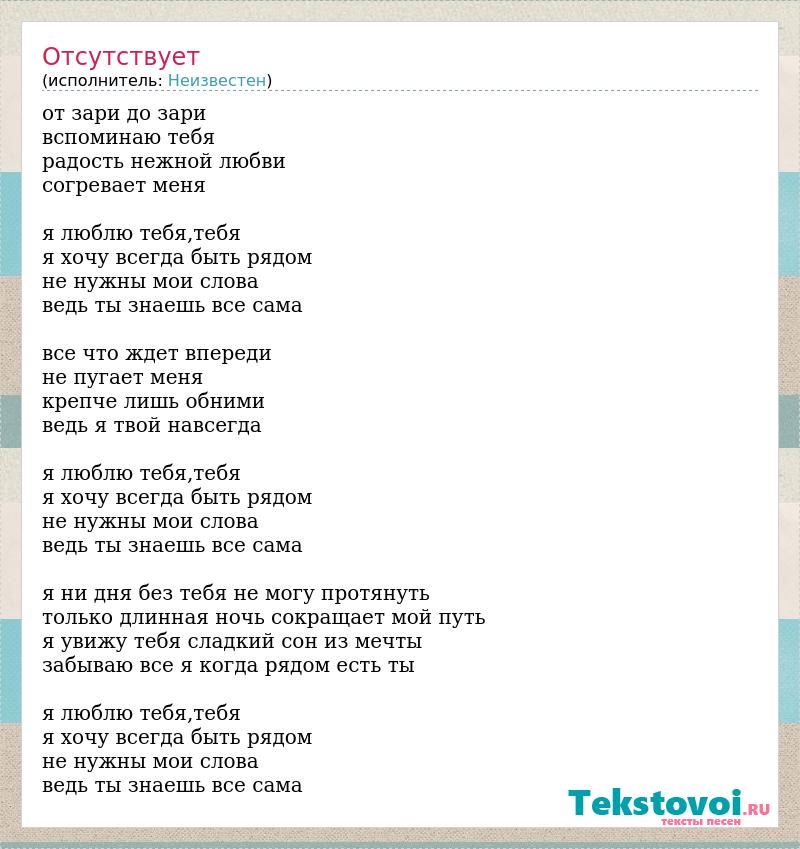 от зари до зари вспоминаю тебя радость нежной любви согревает меня я люблю тебя,тебя я хочу всегда быть рядом не нужны мои слова ведь ты знаешь все сама все что ждет впереди не пугает меня крепче лишь обними ведь я твой навсегда я люблю тебя,тебя я хочу всегда быть рядом не нужны мои слова ведь ты знаешь все сама я ни дня без тебя не могу протянуть только длинная ночь сокращает мой путь я увижу тебя сладкий сон из мечты забываю все я когда рядом есть ты я люблю тебя,тебя я хочу всегда быть рядом не нужны мои слова ведь ты знаешь все сама