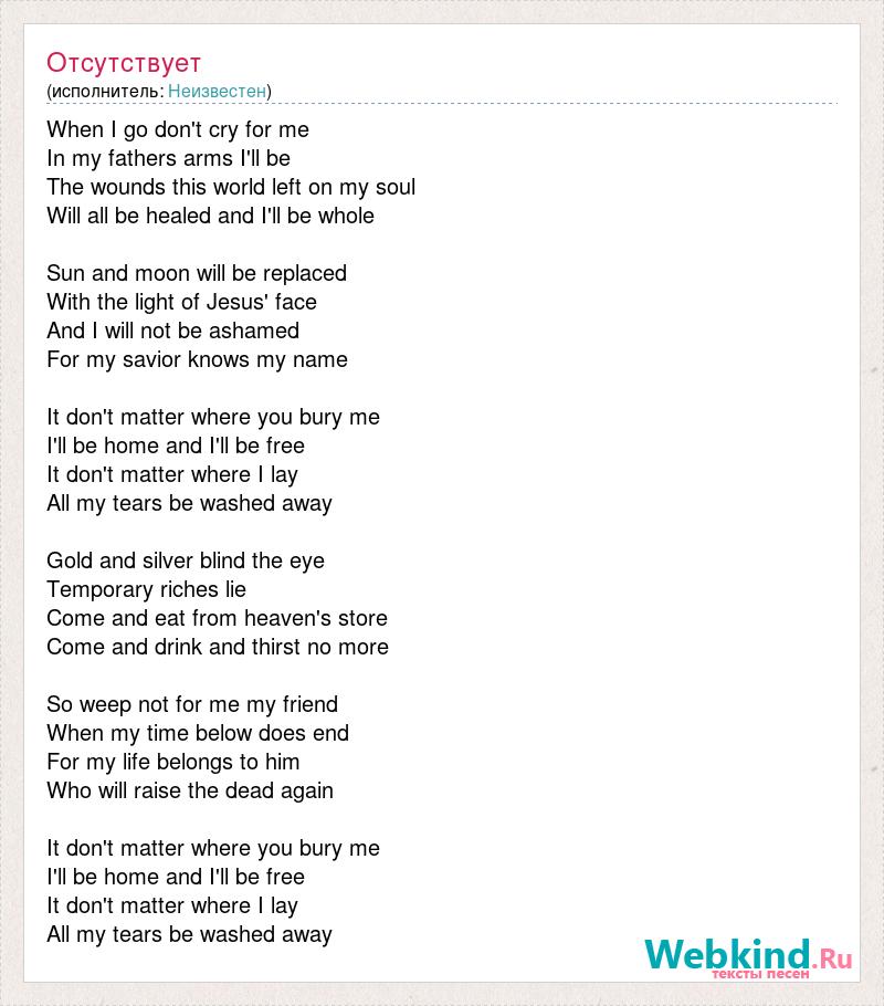 When I go don't cry for me In my fathers arms I'll be The wounds this world left on my soul Will all be healed and I'll be whole Sun and moon will be replaced With the light of Jesus' face And I will not be ashamed For my savior knows my name It don't matter where you bury me I'll be home and I'll be free It don't matter where I lay All my tears be washed away Gold and silver blind the eye Temporary riches lie [bad word] and eat from heaven's store [bad word] and drink and thirst no more So weep not for me my friend When my time below does end For my life belongs to him Who will raise the dead again It don't matter where you bury me I'll be home and I'll be free It don't matter where I lay All my tears be washed away