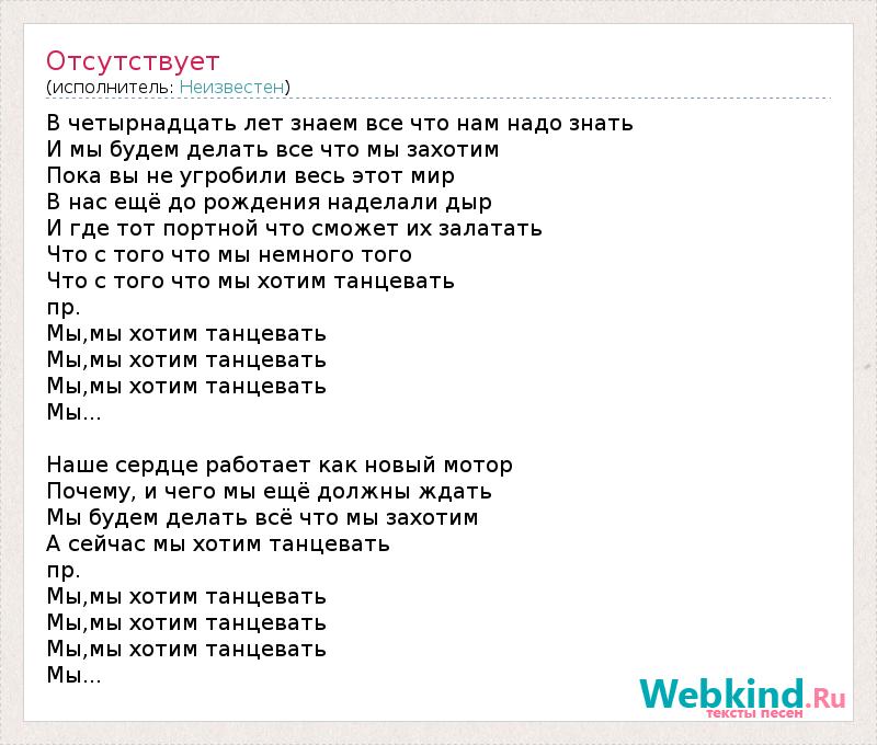 В четырнадцать лет знаем все что нам надо знать И мы будем делать все что мы захотим Пока вы не угробили весь этот мир В нас ещё до рождения наделали дыр И где тот портной что сможет их залатать Что с того что мы немного того Что с того что мы хотим танцевать пр. Мы,мы хотим танцевать Мы,мы хотим танцевать Мы,мы хотим танцевать Мы... Наше сердце работает как новый мотор Почему, и чего мы ещё должны ждать Мы будем делать всё что мы захотим А сейчас мы хотим танцевать пр. Мы,мы хотим танцевать Мы,мы хотим танцевать Мы,мы хотим танцевать Мы...