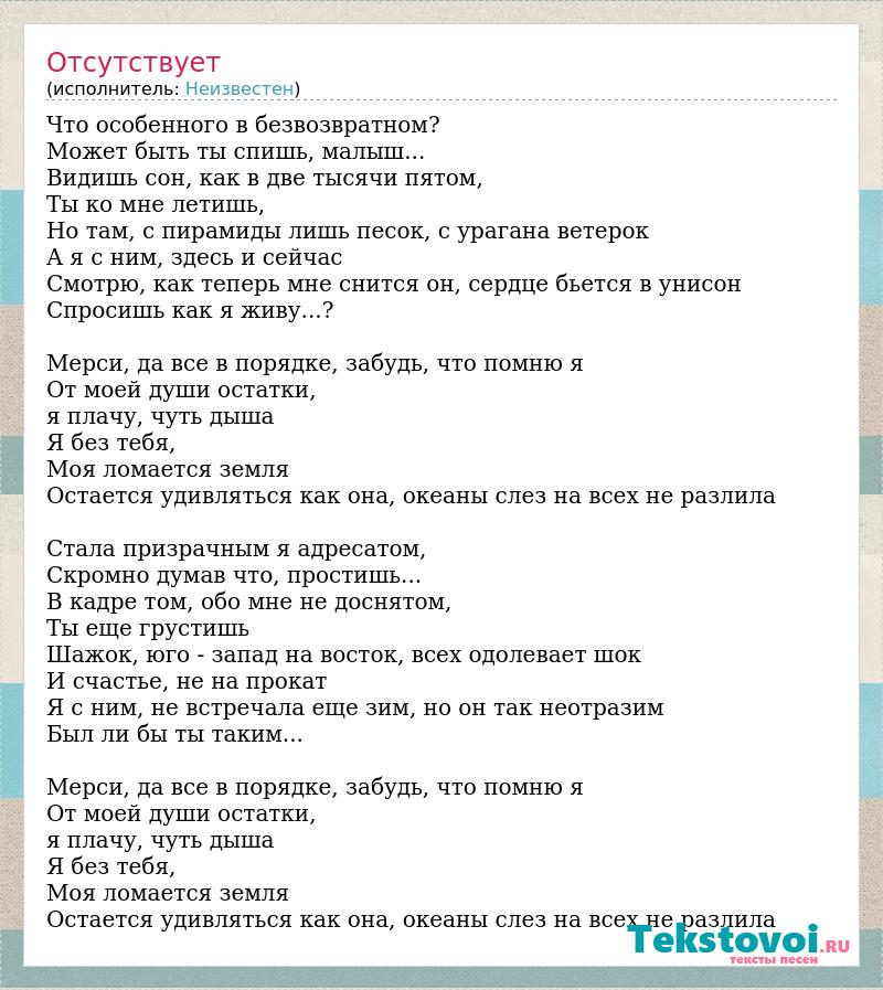 Что особенного в безвозвратном? Может быть ты спишь, малыш... Видишь сон, как в две тысячи пятом, Ты ко мне летишь, Но там, с пирамиды лишь песок, с урагана ветерок А я с ним, здесь и сейчас Смотрю, как теперь мне снится он, сердце бьется в унисон Спросишь как я живу...? Мерси, да все в порядке, забудь, что помню я От моей души остатки, я плачу, чуть дыша Я без тебя, Моя ломается земля Остается удивляться как она, океаны слез на всех не разлила Стала призрачным я адресатом, Скромно думав что, простишь... В кадре том, обо мне не доснятом, Ты еще грустишь Шажок, юго - запад на восток, всех одолевает шок И счастье, не на прокат Я с ним, не встречала еще зим, но он так неотразим Был ли бы ты таким... Мерси, да все в порядке, забудь, что помню я От моей души остатки, я плачу, чуть дыша Я без тебя, Моя ломается земля Остается удивляться как она, океаны слез на всех не разлила