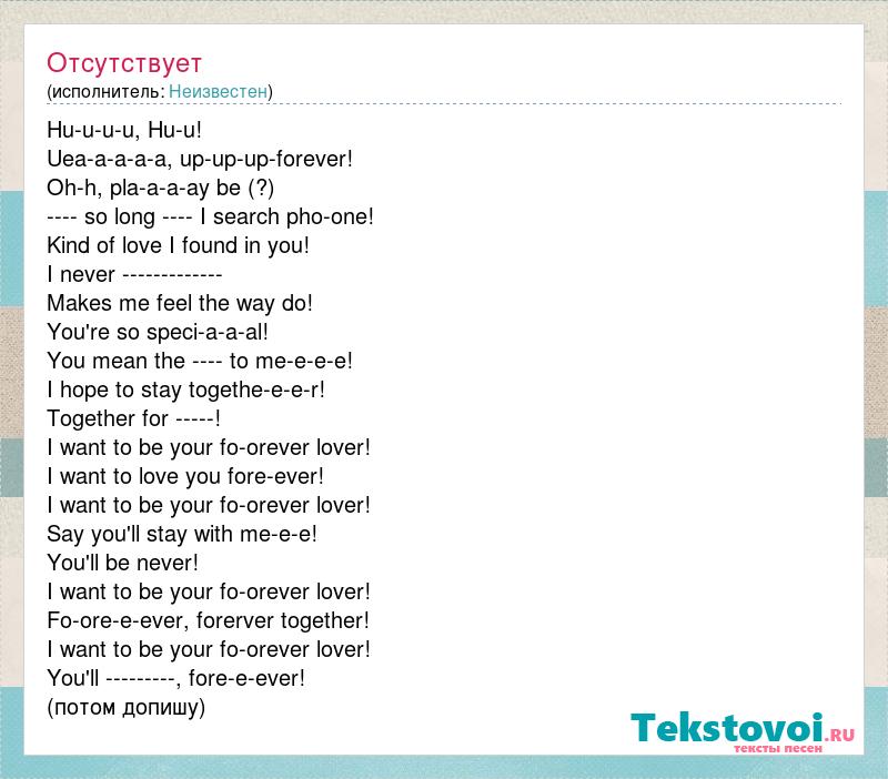 Hu-u-u-u, Hu-u! Uea-a-a-a-a, up-up-up-forever! Oh-h, pla-a-a-ay be (?) ---- so long ---- I search pho-one! Kind of love I found in you! I never ------------- Makes me feel the way do! You're so speci-a-a-al! You mean the ---- to me-e-e-e! I hope to stay togethe-e-e-r! Together for -----! I want to be your fo-orever lover! I want to love you fore-ever! I want to be your fo-orever lover! Say you'll stay with me-e-e! You'll be never! I want to be your fo-orever lover! Fo-ore-e-ever, forerver together! I want to be your fo-orever lover! You'll ---------, fore-e-ever! (потом допишу)