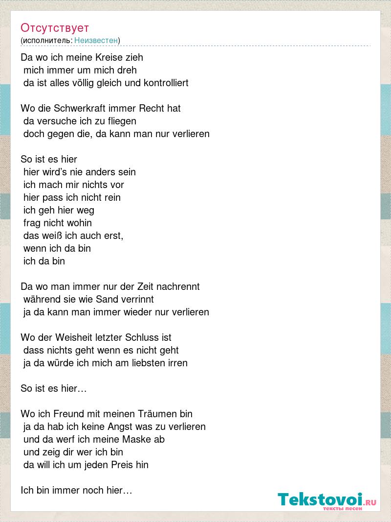Da wo ich meine Kreise zieh mich immer um mich dreh da ist alles völlig gleich und kontrolliert Wo die Schwerkraft immer Recht hat da versuche ich zu fliegen doch gegen die, da kann man nur verlieren So ist es hier hier wird’s nie anders sein ich mach mir nichts vor hier pass ich nicht rein ich geh hier weg frag nicht wohin das weiß ich auch erst, wenn ich da bin ich da bin Da wo man immer nur der Zeit nachrennt während sie wie Sand verrinnt ja da kann man immer wieder nur verlieren Wo der Weisheit letzter Schluss ist dass nichts geht wenn es nicht geht ja da würde ich mich am liebsten irren So ist es hier… Wo ich Freund mit meinen Träumen bin ja da hab ich keine Angst was zu verlieren und da werf ich meine Maske ab und zeig dir wer ich bin da will ich um jeden Preis hin Ich bin immer noch hier…