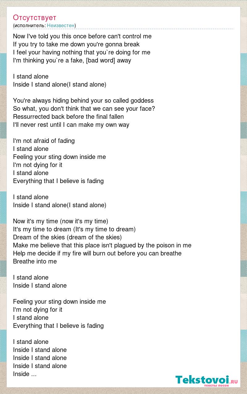 Now I've told you this once before can't control me If you try to take me down you're gonna break I feel your having nothing that you`re doing for me I'm thinking you`re a fake, [bad word] away I stand alone Inside I stand alone(I stand alone) You're always hiding behind your so called goddess So what, you don't think that we can see your face? Ressurrected back before the final fallen I'll never rest until I can make my own way I'm not afraid of fading I stand alone Feeling your sting down inside me I'm not dying for it I stand alone Everything that I believe is fading I stand alone Inside I stand alone(I stand alone) Now it's my time (now it's my time) It's my time to dream (It's my time to dream) Dream of the skies (dream of the skies) Make me believe that this place isn't plagued by the poison in me Help me decide if my fire will burn out before you can breathe Breathe into me I stand alone Inside I stand alone Feeling your sting down inside me I'm not dying for it I stand alone Everything that I believe is fading I stand alone Inside I stand alone Inside I stand alone Inside I stand alone Inside ...