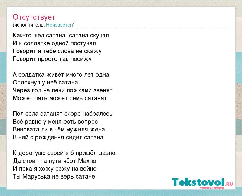 Как-то шёл сатана сатана скучал И к солдатке одной постучал Говорит я тебе слова не скажу Говорит просто так посижу А солдатка живёт много лет одна Отдохнул у неё сатана Через год на печи ложками звенят Может пять может семь сатанят Пол села сатанят скоро набралось Всё равно у меня есть вопрос Виновата ли в чём мужняя жена В ней с рожденья сидит сатана К дорогуше своей я б пришёл давно Да стоит на пути чёрт Махно И пока я хожу езжу на войне Ты Маруська не верь сатане