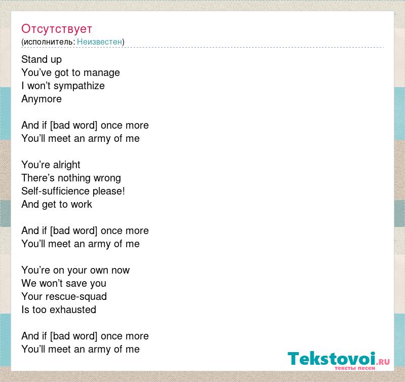 Stand up You’ve got to manage I won’t sympathize Anymore And if [bad word] once more You’ll meet an army of me You’re alright There’s nothing wrong Self-sufficience please! And get to work And if [bad word] once more You’ll meet an army of me You’re on your own now We won’t save you Your rescue-squad Is too exhausted And if [bad word] once more You’ll meet an army of me