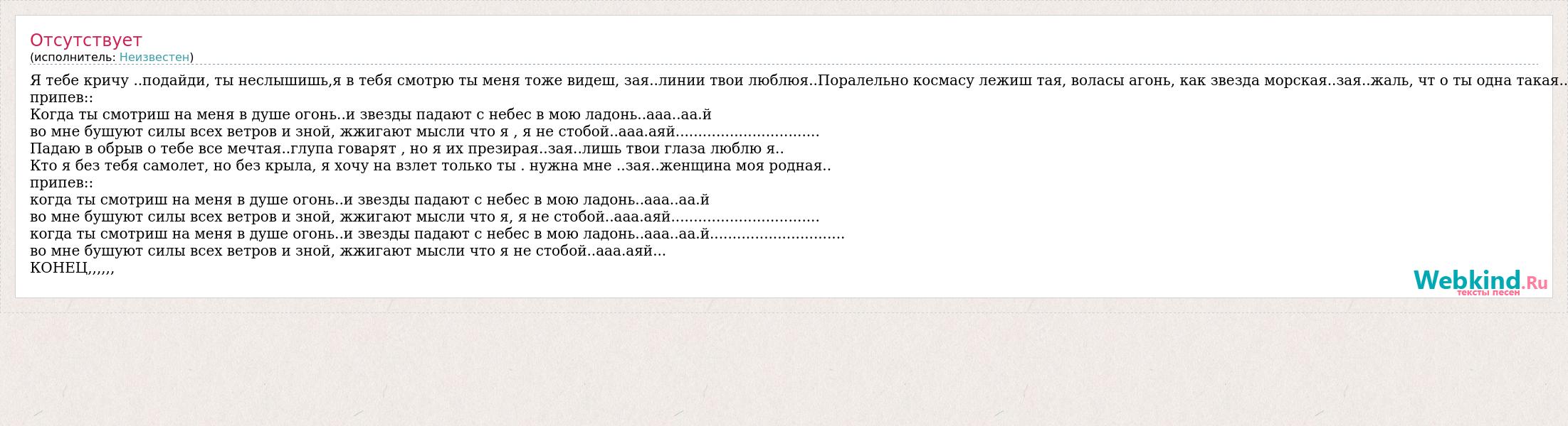 Я тебе кричу ..подайди, ты неслышишь,я в тебя смотрю ты меня тоже видеш, зая..линии твои люблюя..Поралельно космасу лежиш тая, воласы агонь, как звезда морская..зая..жаль, чт о ты одна такая.. припев:: Когда ты смотриш на меня в душе огонь..и звезды падают с небес в мою ладонь..ааа..аа.й во мне бушуют силы всех ветров и зной, жжигают мысли что я , я не стобой..ааа.аяй................................ Падаю в обрыв о тебе все мечтая..глупа говарят , но я их презирая..зая..лишь твои глаза люблю я.. Кто я без тебя самолет, но без крыла, я хочу на взлет только ты . нужна мне ..зая..женщина моя родная.. припев:: когда ты смотриш на меня в душе огонь..и звезды падают с небес в мою ладонь..ааа..аа.й во мне бушуют силы всех ветров и зной, жжигают мысли что я, я не стобой..ааа.аяй................................. когда ты смотриш на меня в душе огонь..и звезды падают с небес в мою ладонь..ааа..аа.й.............................. во мне бушуют силы всех ветров и зной, жжигают мысли что я не стобой..ааа.аяй... КОНЕЦ,,,,,,